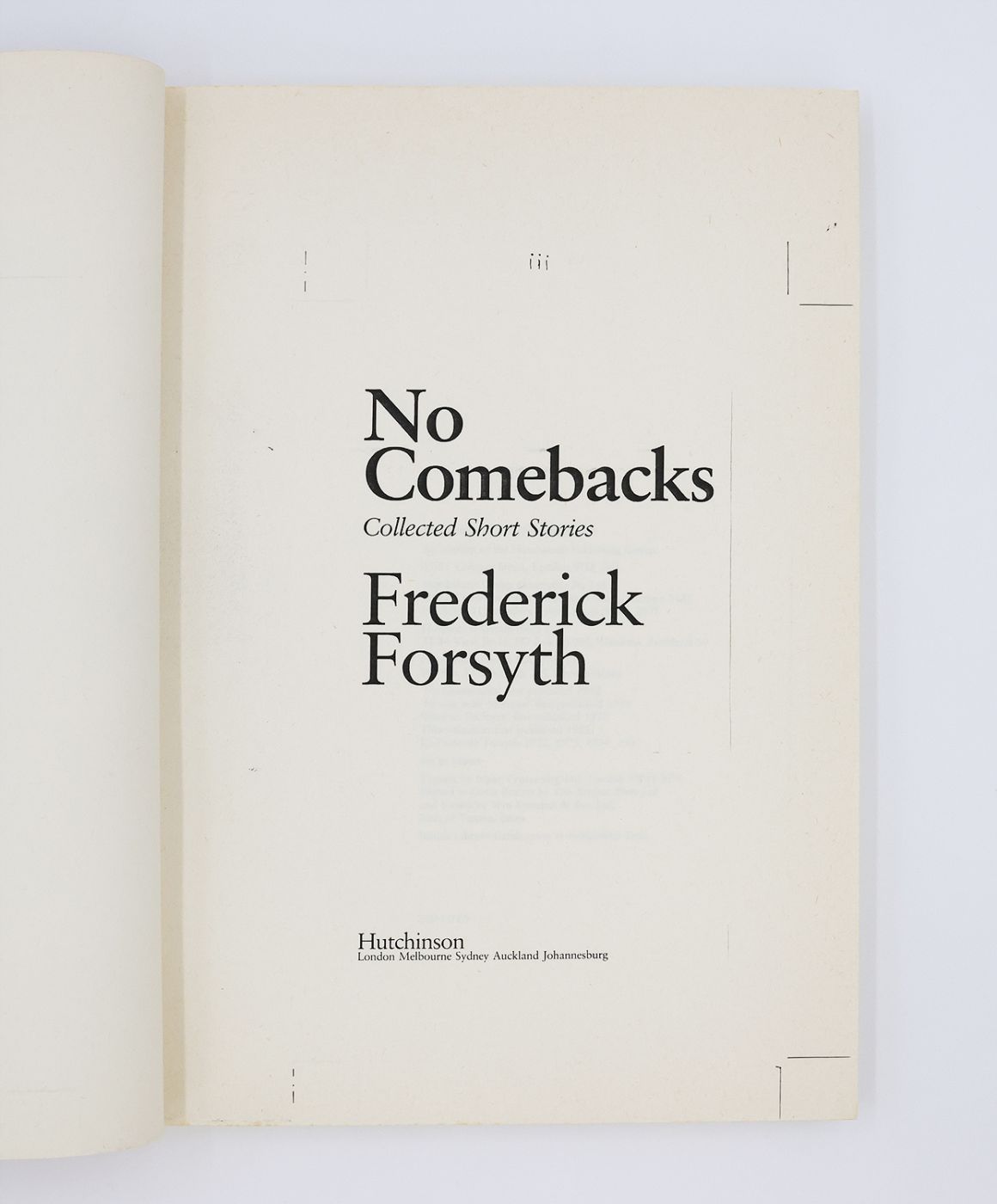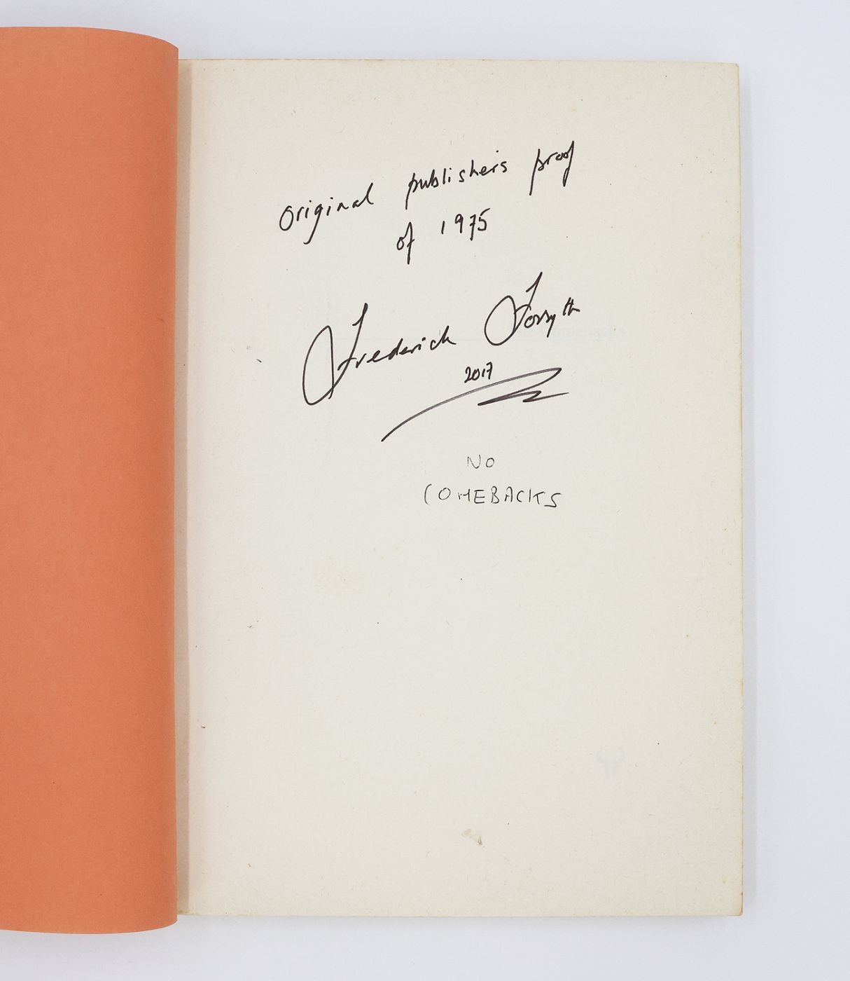 Inscribed by the author in black ink on the front blank "Original publisher's proof of 1975 / Frederick Forsyth 2017". This item forms part of a collection of the author's own proofs, manuscripts and film scripts, gifted to and inscribed for a close friend in 2017. Forsyth's inscription, in this case, is misstated as whilst the story 'No Comebacks' was written in the early 1970s, this collection of ten short stories was not published until 1982. Provenance: Frederick Forsyth; gifted to Sally Harrison (2017).