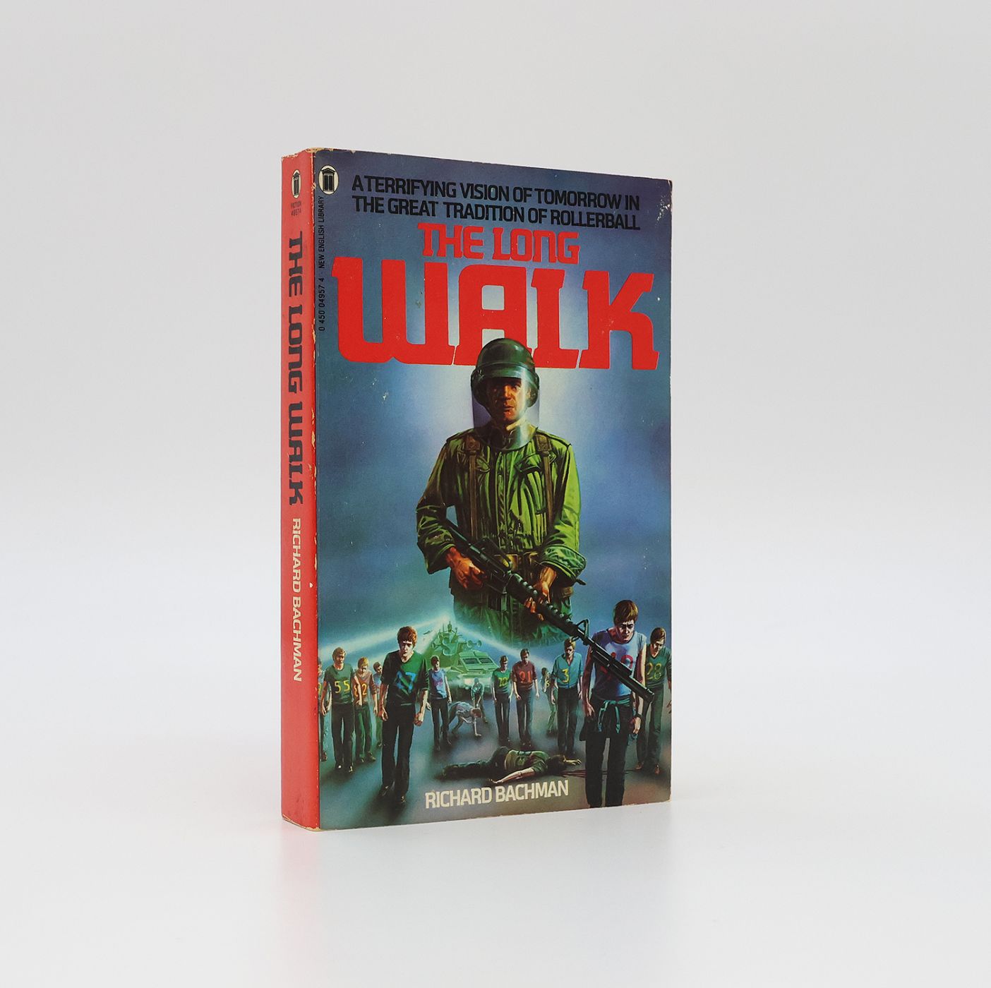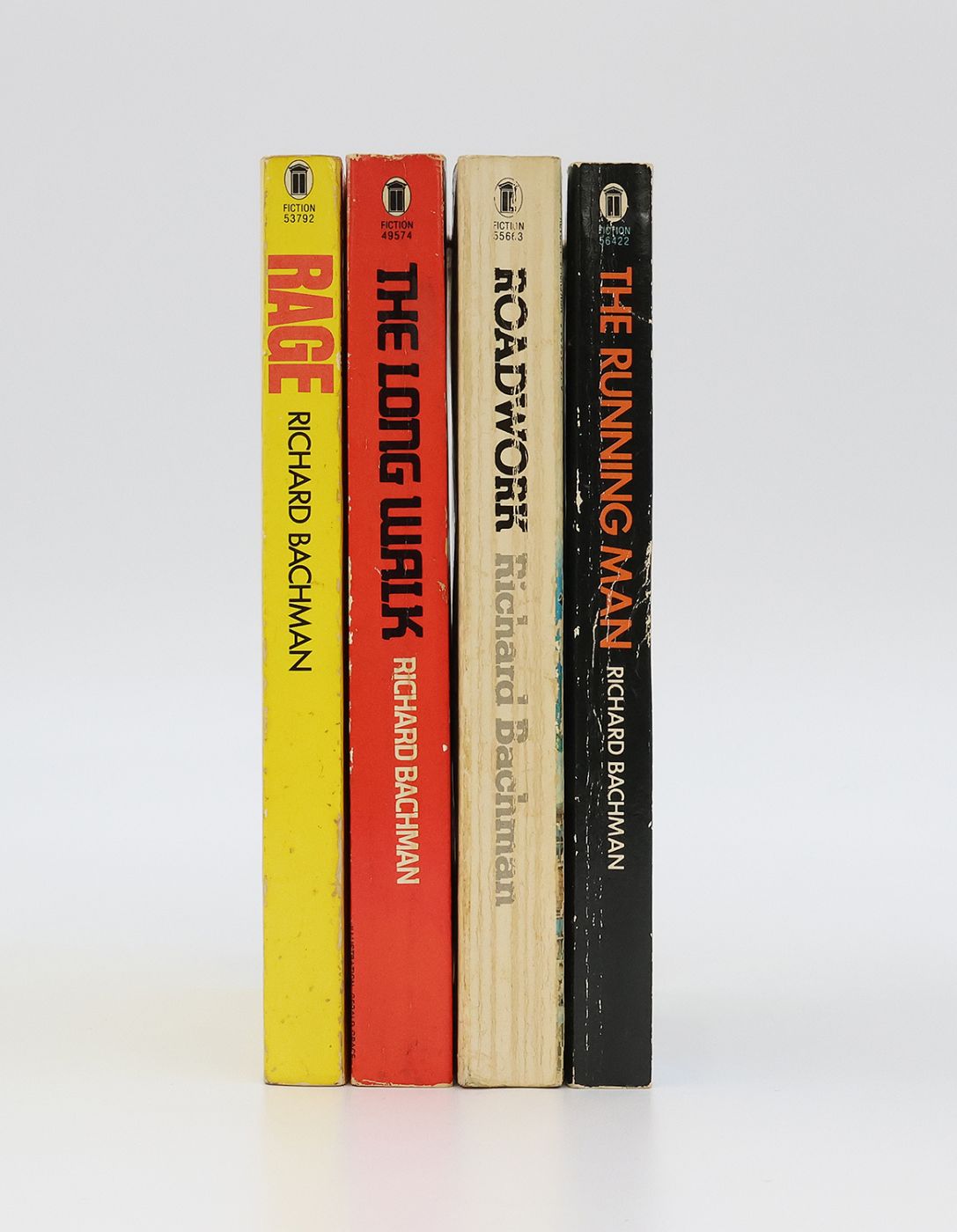 First UK editions, first printings. Four volumes. Paperback originals. Publishers original pictorial card covers. 'Rage' is a very good copy the binding square and firm with just minor creasing, the colours bright. The contents, with mild toning of the paper-stock are otherwise clean throughout. 'The Long Walk' is in very good condition, the binding square and firm with a little rubbing to the spine edges, the colours bright and fresh. The contents, with a little toning of the paper-stock are otherwise clean throughout and without inscriptions or stamps. 'Roadwork' is in near very good condition, the binding firm with rubbing and creasing to the edges and corners, the spine a touch concave and with vertical reading creases. The contents, with a little toning of the paper-stock and some wrinkling to the lower right corner (probably from moisture but without staining) are otherwise clean throughout. The bottom edge of the closed text block has a faint circular ink stamp in red. 'The Running Man' is a very good copy, the binding square and firm with a little rubbing at the extremities, the clolour and bright and fresh. The contents, a little toned to the paper-stock are otherwise clean throughout and without inscriptions or stamps.
