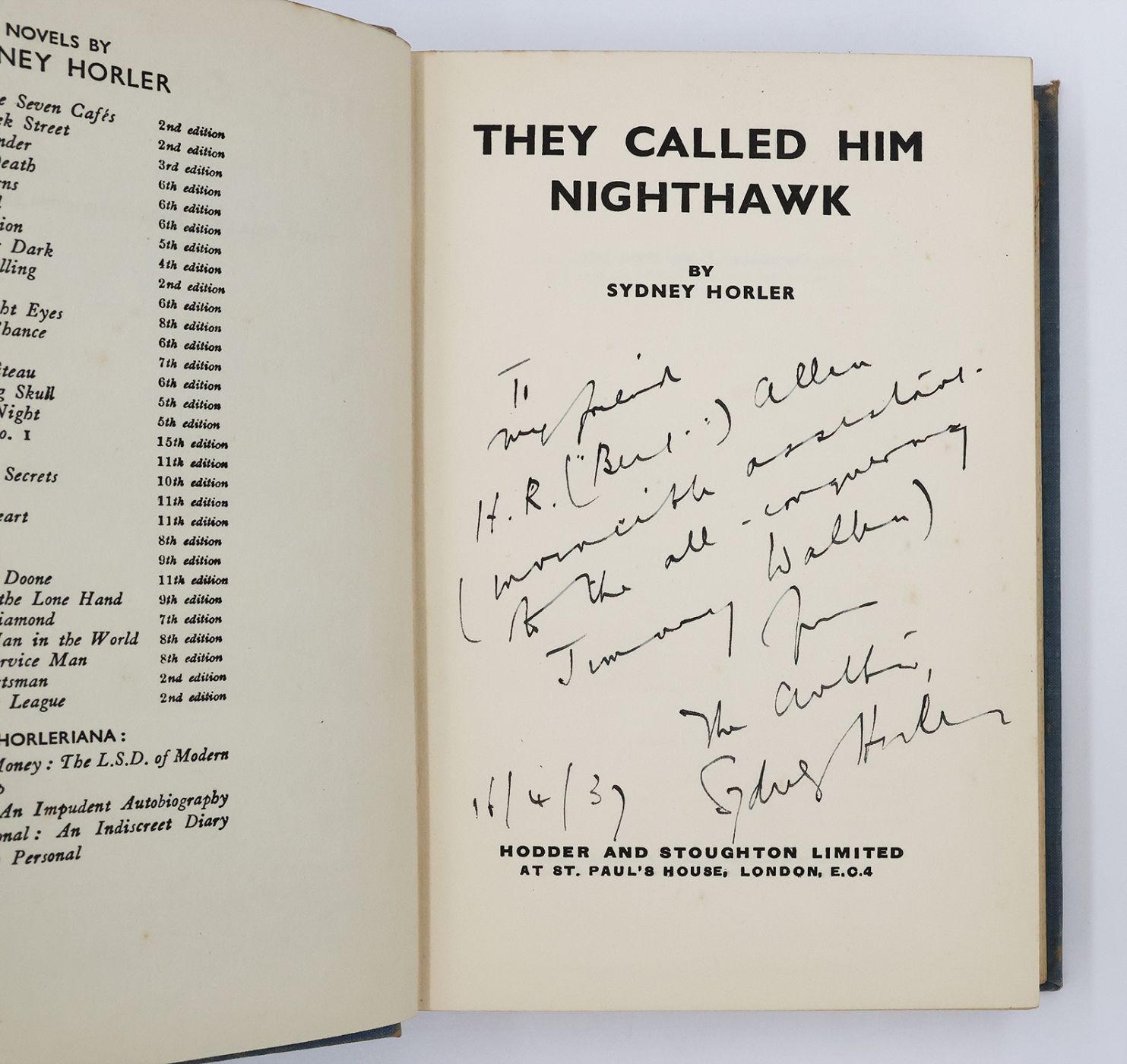 Inscribed by the author in black ink on the title page "To / My friend / H. R. ("Burt") Allen / (Herewith assistant / to the all conquering / Jimmy Walker) / from / the author / Sydney Horler / 11.4.37". The first of six crime novels to feature Gerald Frost, the cracksman and jewel thief known as 'Nighthawk'. (Hubin).