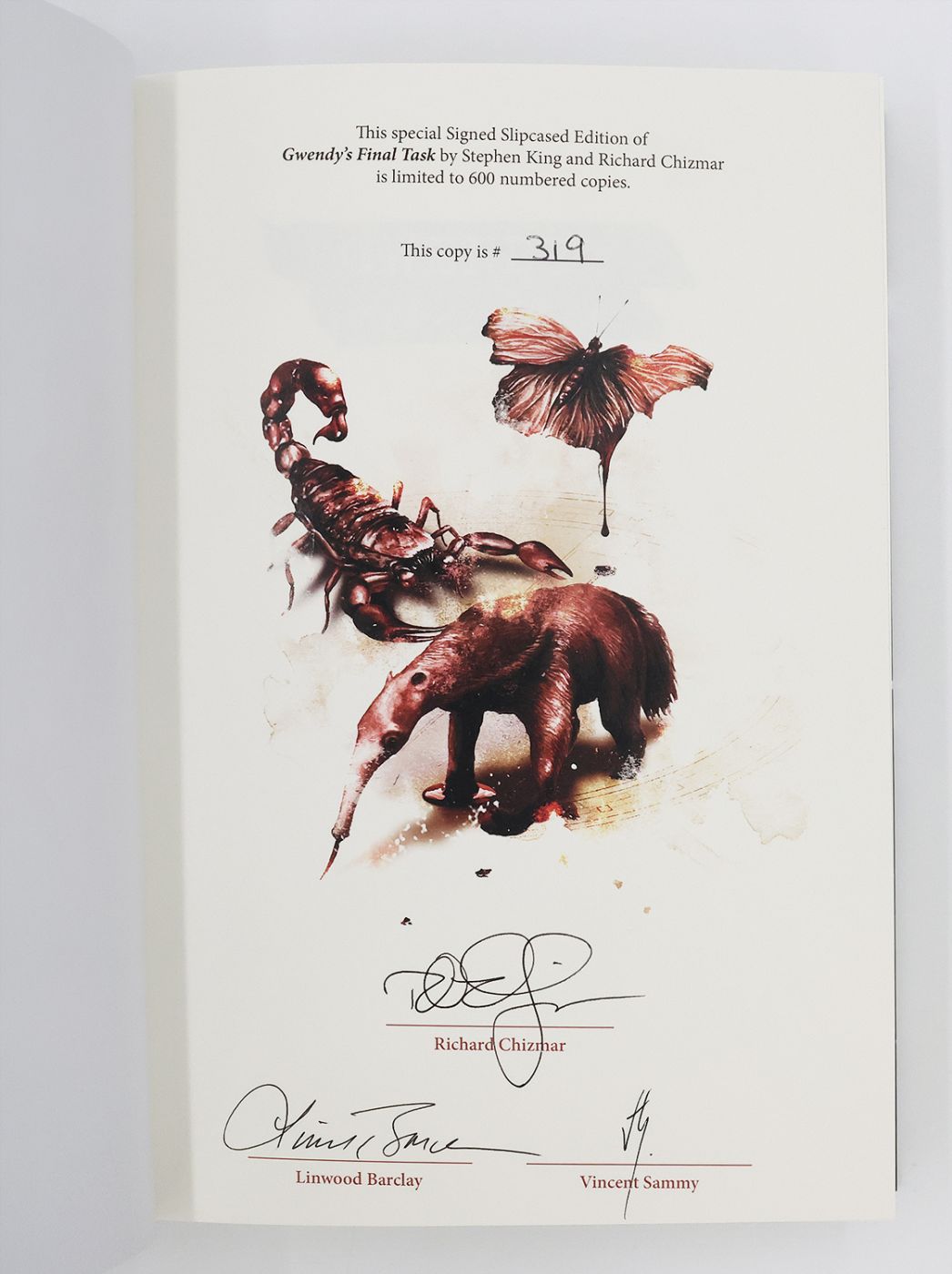 Issued in a limited edition of 600 copies, with this example being number 319. Signed by the author Richard Chizmar, illustrator Vincent Sammy and the author of the foreword Linwood Barclay in black ink on the limitation page. The final novel in 'The Gwendy Trilogy'.
