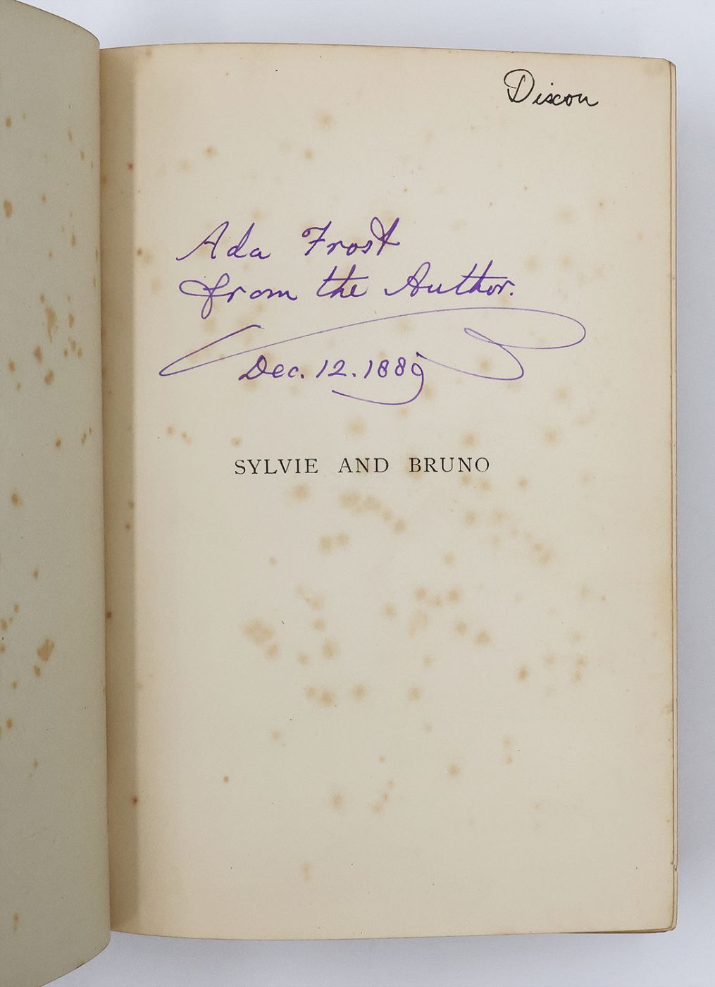 'Sylvie and Bruno' is inscribed on the half title in purple ink "Ada Frost / from the Author / [flourish] / Dec. 12. 1889" above which the recipient has inscribed "Dixon" in black. 'Sylvie and Bruno Concluded' is inscribed in black ink on the half title "Mrs Dixon, / with the Author's kind regards, / [flourish] / Dec. 28, 1893". The recipient Ada Dixon, (née Frost, 1874-1964), was a professional child model who sat for sketches made by Dodgson in Mrs Shute's studio in 1888 (Letters 2: 692-93), after which the author presented her with a specially bound, presentation copy of 'Alice's Adventures in Wonderland'. The present copy of Sylvie and Bruno followed on first publication, shortly after. In 1892, on receiving a letter from Ada advising of her marriage, Dodgson sent a specially bound presentation copy of 'Through the Looking Glass' to match the Alice he had given her four years earlier, followed shortly after by the present copy of 'Sylvie and Bruno Concluded', his final work for children. Whilst Dodgson is known primarily for his writing, he was also a keen amateur photographer and artist. He created thousands of photographs in the Victorian symbolist tradition formed by the likes of Julia Margaret Cameron and Oscar Gustave Rejlander, and illustrated his own written drafts, including a precursor to what would become 'Alice's Adventures in Wonderland', a hand written manuscript titled 'Alice's Adventures Under Ground'. Ada Dixon was among many models who posed for Dodgson's photographs and sketches, and it was not uncommon for him to form friendships with them, exchanging letters and even attending their weddings. The most famous of his models is undoubtedly Alice's namesake herself, Alice Liddell, a daughter of Henry Liddell, who was the Dean of Christ Church College, Oxford, where Dodgson was a lecturer of mathematics. As well as employing them as photographic subjects, Dodgson would take the Liddell children out on rowing trips, and it was on one such trip that he first told a tale of the fantasy world through the rabbit hole, which Alice Liddell enjoyed so much that she begged him to write it down. Provenance: presented by the author to Ada Dixon (nee Frost) in 1889 and 1893, thence by family descent.