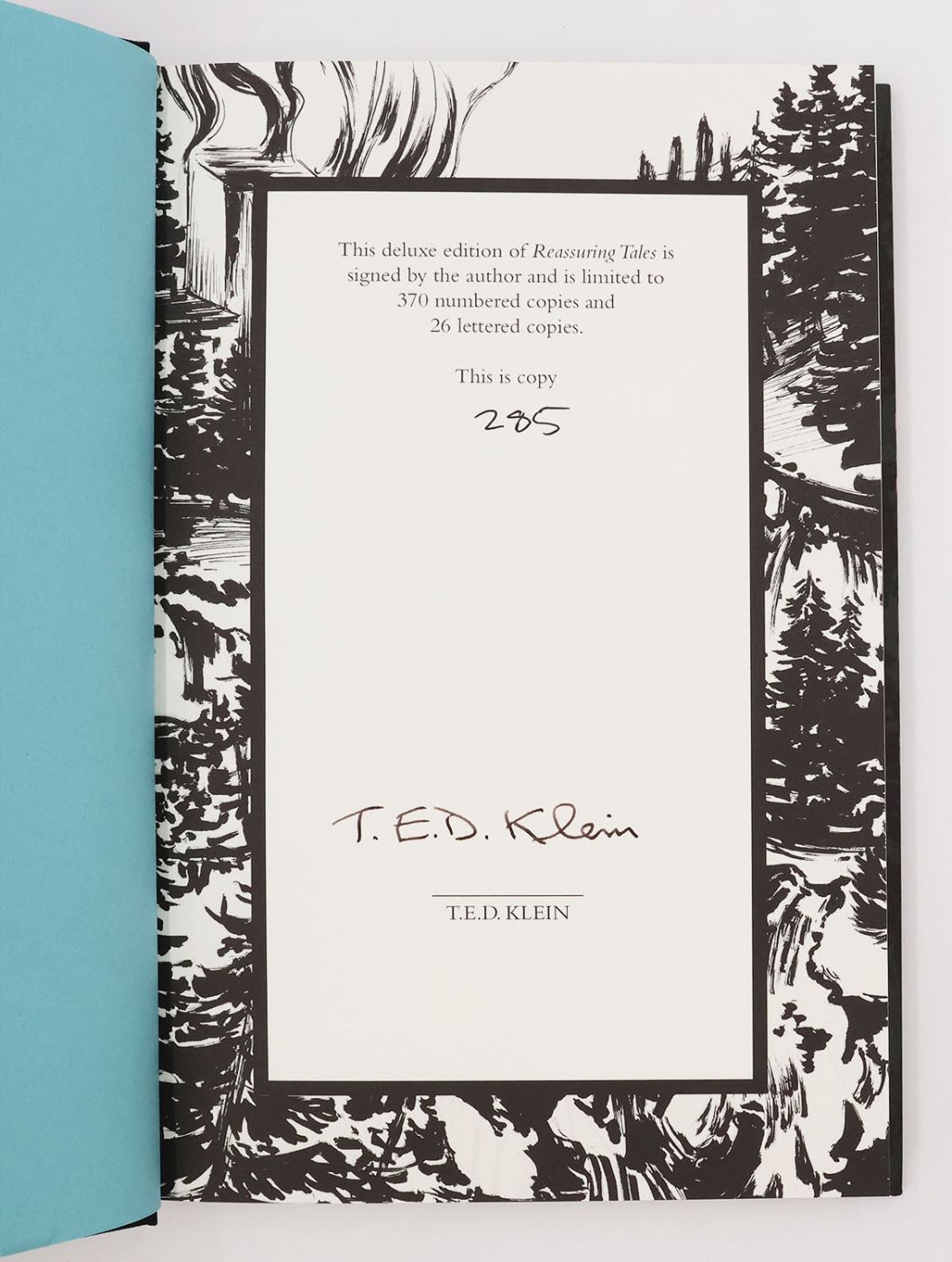 Issued in an edition of 370 numbered copies and 26 lettered copies from which this example is numbered 285 and igned by the author T. E. D. Klein in black ink on the limitation page. A collection of horror short stories including "The Events at Poroth Farm", "One Size Eats All", "Well-Connected", "Camera Shy", "Ladder", "Renaissance Man", "Curtains for Nat Crumley", and "Magic Carpet".