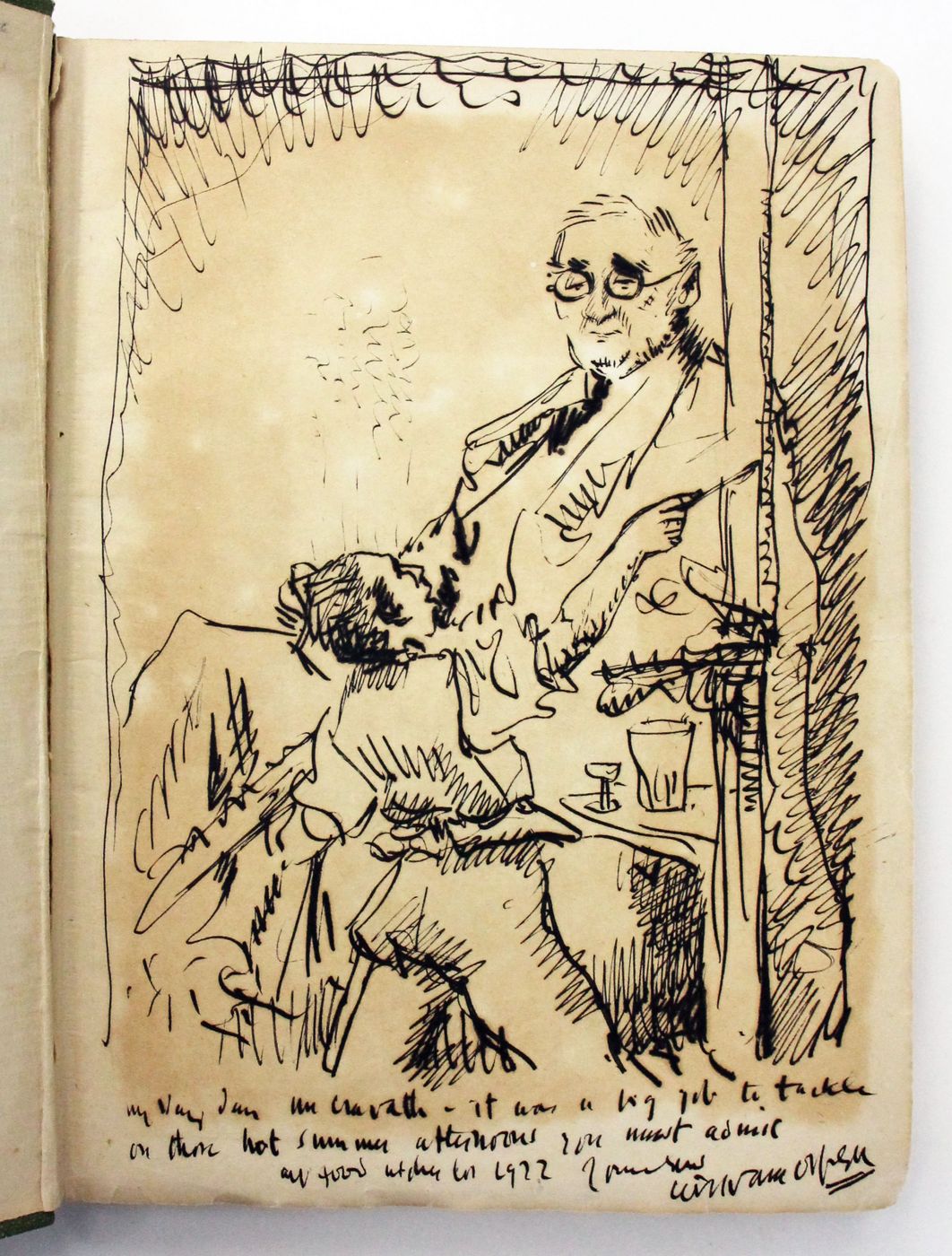 With a full page original ink self portrait of Orpen on the front blank endpaper, depicting the artist painting the famous American Wall Street lawyer and art collector, Paul Cravath. The drawing is inscribed by Orpen at the bottom of the page "My very dear Mr Cravath - It was a big job to tackle / on those hot summer afternoons you must admit / All good wishes in 1922. / Yours / William Orpen". Roberts' note on the reverse of the frontispiece explains that Cravath was presented the book, embellished with hand drawn portraits of both subject and artist on completion of his commissioned portrait (painted at Cravath's Regency Long Island home), for which Orpen was paid a sum of £5000 plus expenses. The house, and presumably some of the contents, was bought by Baron Eugene de Rothschild after Corvath's death in 1940, Roberts noting that he was often his guest there, although doesn't elaborate as to how the book entered into his ownership. There is one more note from Roberts, under the portrait of Lord Riddell (plate XLIX) mentioning his being at a press dinner given for him in 1919. Aside from being third in charge, and legal advisor, of the American War Mission during the Inter-allied War Conference of 1917, the first American mission to a European council in history, Paul Cravath is mainly known for his "Cravath System" which transformed the way law firms work and is still in use today. The "Cravath system" included hiring new law school graduates, then training them within the firm as associates, and eventually inviting the best to become partners. Throughout the twentieth century most of the growth of the big law firms relied on this system of recruiting, internal training, and loyalty to the firm.