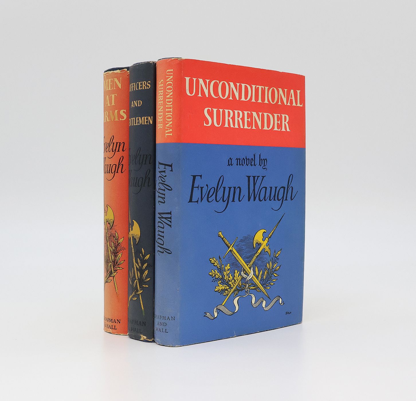 First edition, first printing. Three volumes. Each volume bound in the publisher's original blue cloth with gilt titles to the spine, in the Val Biro designed and illustrated dustwrapper. Top edge blue. All are very near fine copies, the binding square and firm, the cloth and gilt bright and fresh. The contents, the one foxing spot to the endpaper of volume two are otherwise clean throughout and without inscriptions or stamps. Complete with the uniformly very good, rubbed, and nicked dustwrappers, the first volume with a small piece of tape at the top and bottom of the front flap fold, the second volume with a small piece of tape to the lower spine tipall three with a touch of faded to the spine. Not price-clipped (Men At Arms with a 12/6 paper label over the printed price of 15s net; Officers and Gentlemen 12s 6d net; Unconditional Surrender 18s to the lower front flap).