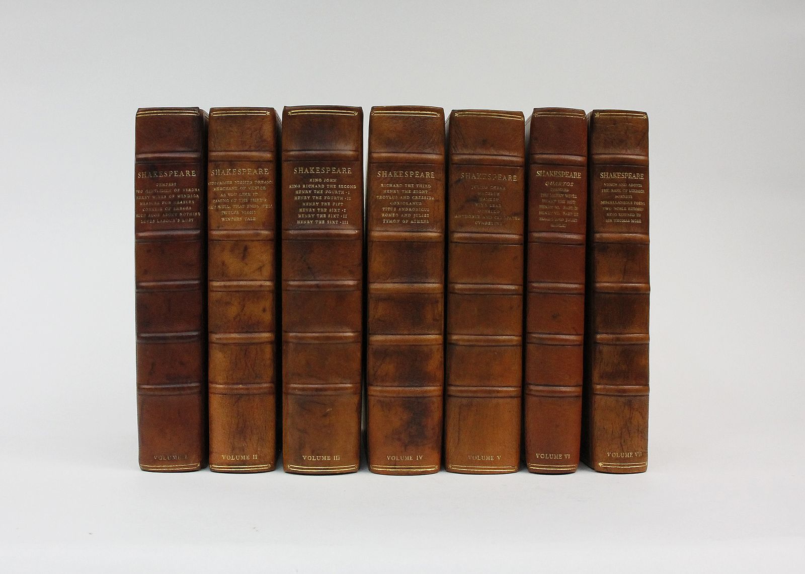Limited edition. Seven volumes. Original full tan niger morocco by A. W. Bain, upper and lower boards and spine ends double ruled in gilt with tiny corner pieces. Five raised bands and titles in gilt to the spine. Single gilt ruled turn ins. Top edge gilt over red. Designed by Francis Meynell, set in Monotype Fournier and printed by the Cambridge University Press on Pannekoek mould-made paper. No. 1385. An excellent set, the bindings square and firm with some natural patina to the morocco and darkening of the spines. The contents, with the small green morocco bookplate of B.V.R. Overbury to the top of the front pastedown of each volume and minor toning to the page edges of the prelims, are otherwise clean and bright throughout.