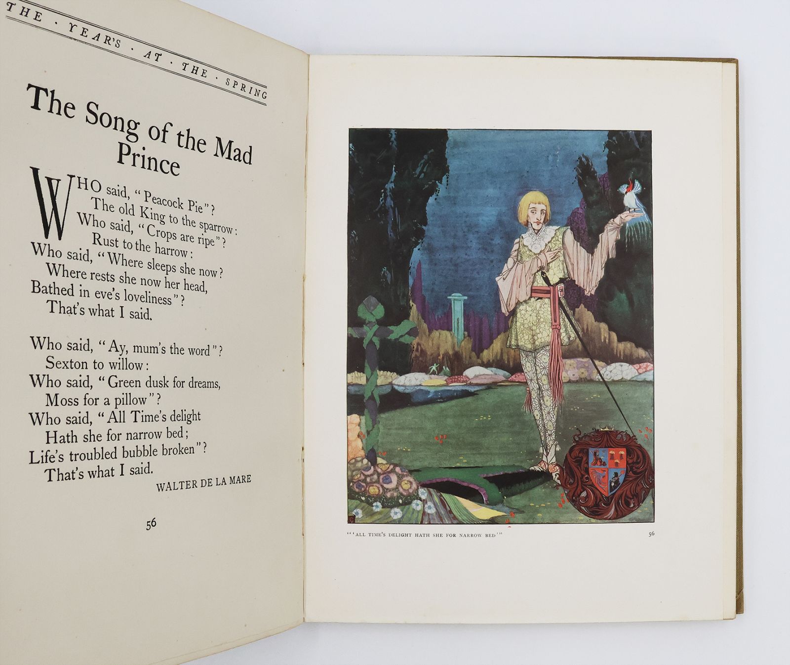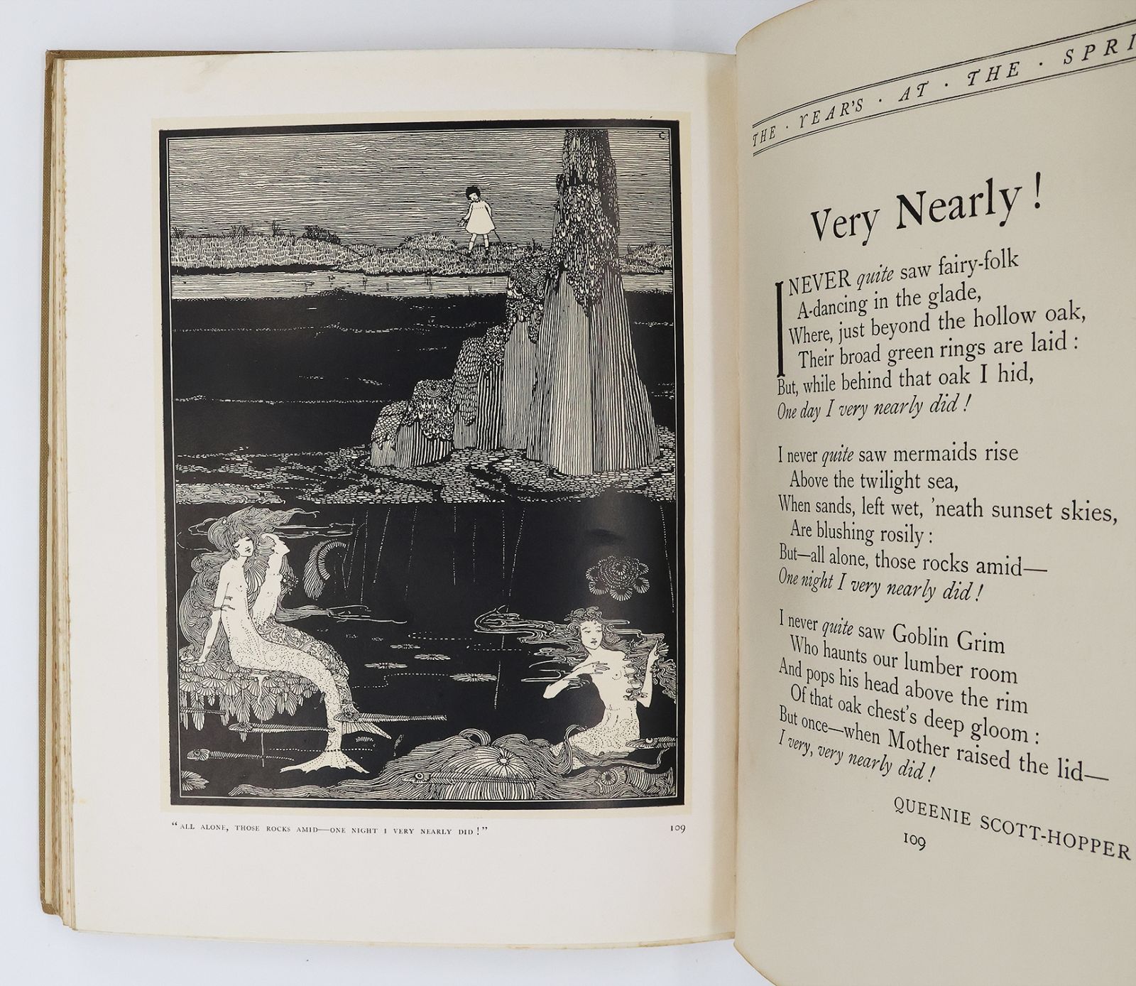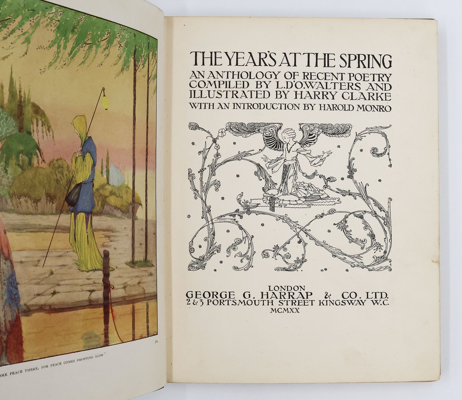 A beautifully illustrated anthology featuring work by poets such as Rupert Brooke, Walter De La Mare, W. B. Yeats and Thomas Hardy. An excellent example of the illustrative work of the Irish artist Harry Clarke, displaying his typically dark and sinuous Art Nouveau style achieved with a combination of dense line work and airy open space.