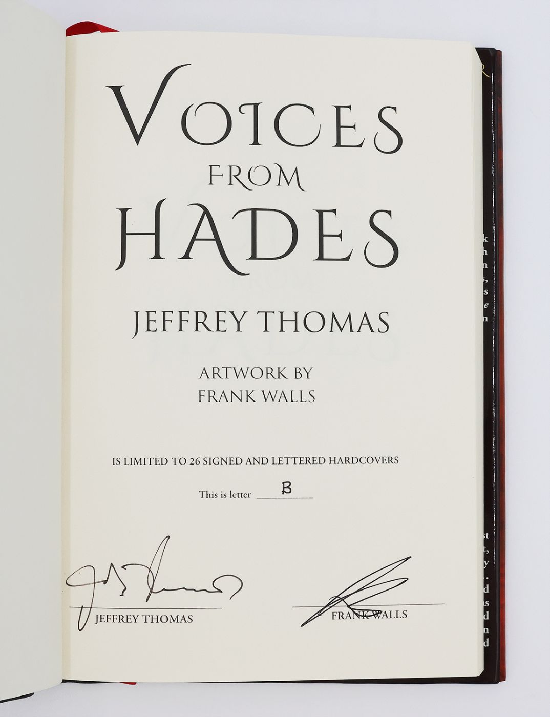Issued in an edition of 26 lettered deluxe hardcovers from which this example is lettered 'B' and signed by the author and illustrator in black ink on the limitation page. 'Voices of Hades' was originally published in 2008 by Dark Regions Press, and is the second volume in Thomas' Hades Trilogy, following 'Letters from Hades' (2003) and followed by 'The Fall of Hades' (2010). A collection of short stories written between 2003 and 2023, this expanded edition includes the additional stories 'Acheron', 'The Bone Arena', 'Good Will Toward Men', and 'The Half-Damned Girl'. Frank Walls is a contemporary American artist known for his dark surrealist style and fantasy illustrations. He has produced cover art for science fiction and horror writers including Jeffrey Thomas, Jeff Strand, and Shane McKenzie (Walls, 2023).
