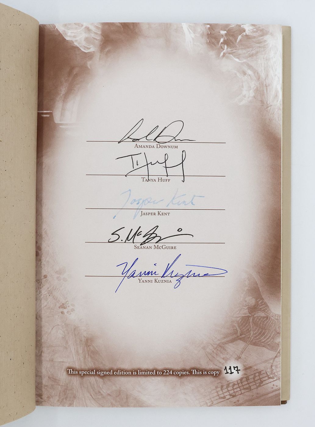 Issued in an edition of 224 copies, from which this example is numbered 117, and signed by Tanya Huff, Amanda Downum, Jasper Kent, Seanan McGuire, and the editor, Yanni Kuznia in black and blue ink on the limitation page.