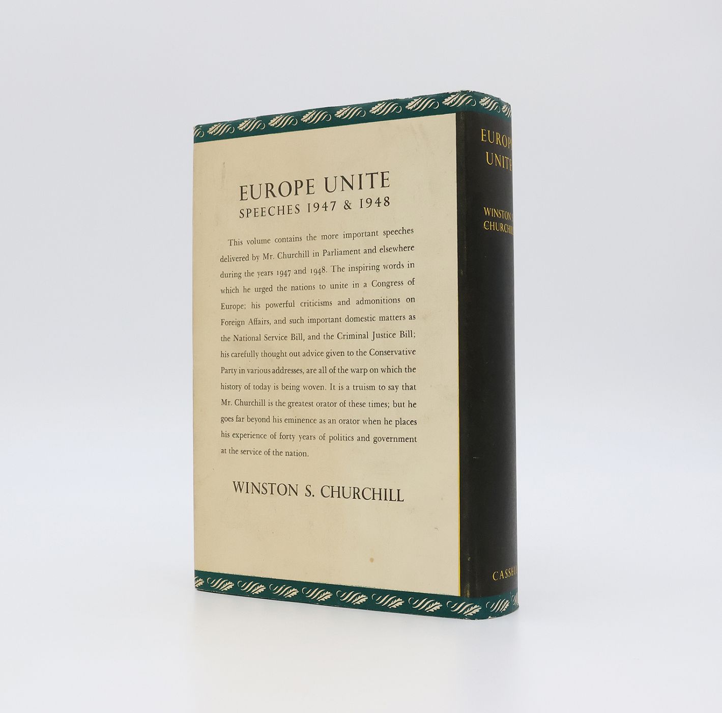 The second volume in former Prime Minister Winston Churchill's Post-War Speeches edited by his son Randolph S. Churchill. A comprehensive compilation of 52 speeches delivered by Churchill in his role as Leader of His Majesty's Opposition during the years 1947 and 48 and spanning many prevalent topics of the time, including Palestine, India, Burmese Independence, and domestic political matters such as national service and the iron and steel industries. The title, 'Europe Unite', is derived from the overarching theme of Churchill's speech given at The Hague on 7th May 1948, which can be read from pp. 310-17 of this volume. A united Europe was a strong and enduring belief of Churchill's, and he frequently used his political platform to call for other nation leaders to join together under a common purpose and rebuild after the devastation wrought by the Second World War (Churchill Archive, 2025). His speech at The Congress of Europe at The Hague praised the response of many European countries to his earlier appeal in Zurich in 1946, and emphasised the need for continued progress without jealousies or rivalries "No one can suppose that Europe can be united on any party or sectional basis, any more than that any one nation can assert an overweening predominance. It must be all for all". (Cohen A246.1; Woods A128a)