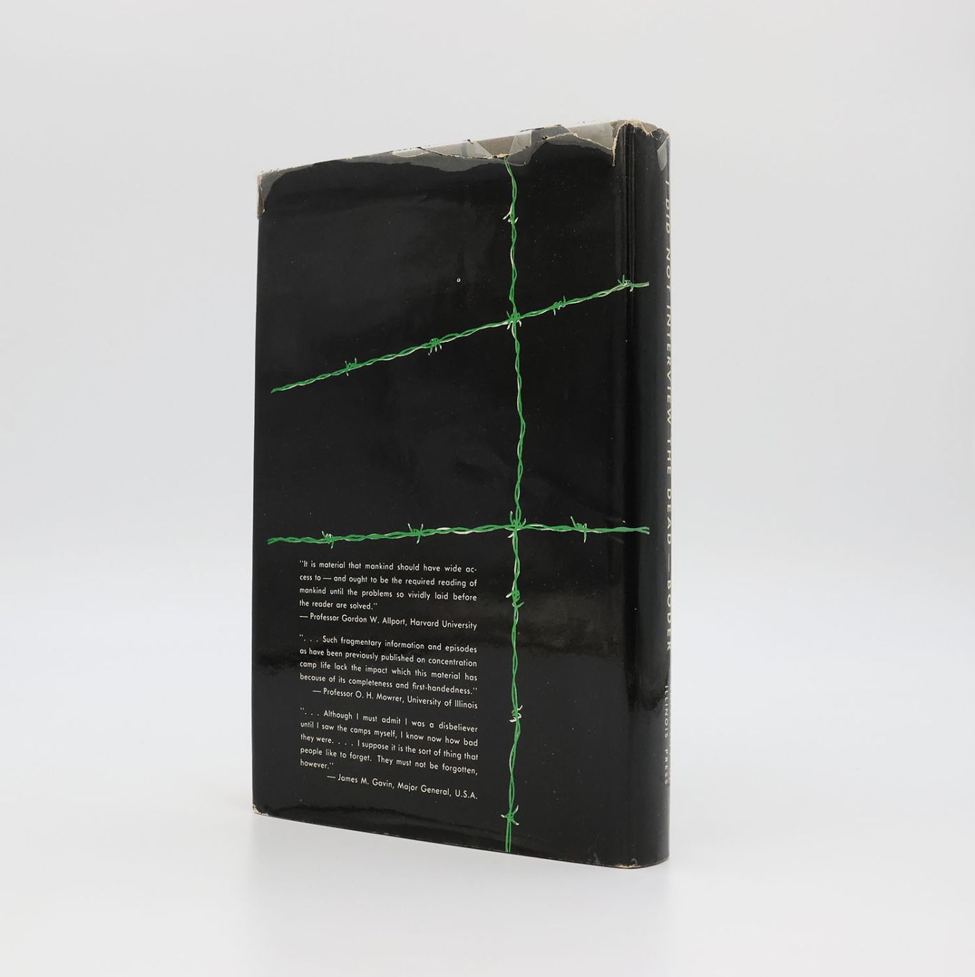 First edition, first printing of David Boder's pioneering work of Holocaust testimony. Publisher's original grey cloth stamped with dark grey barbed wire detail to the upper and lower board and with titles in grey to the spine, in dustwrapper. A very good or better copy, the binding square and firm with a little bumping at the spine tips, the cloth bright and fresh. The contents, with some toning to the front endpaper and half title (where a couple of newspaper clippings had been loosely laid in), are otherwise clean throughout and without inscriptions or stamps. Complete with the rubbed and nicked dustwrapper that has several short closed tears and some small chips to the top edge of the rear panel. Not price-clipped ($3.50 to the upper corner of the front flap). Scarce.