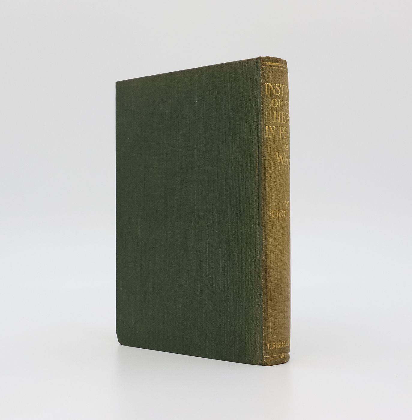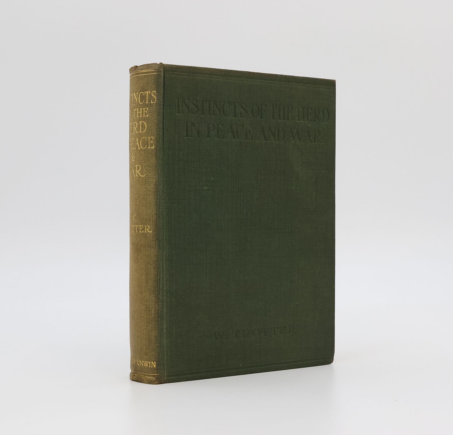A popular and highly influential work of social psychology by philosopher surgeon Wilfred Trotter (1872-1939). 'Instincts of the Herd in Peace and War' comprises a collection of essays introducing the concept of "herd instinct" and discussing the phenomenon of group pressure in determining individual behaviour (Rosen, Irving B.: Canadian Journal of Surgery, 2006). These essays include "Herd Instinct and Its Bearing on the Psychology of Civilized Man" (Trotter's first contribution to the field of crowd psychology, first published in 1908 in The Sociological Review), "Sociological Applications of the Psychology of Herd Instinct", and "Speculations Upon the Human Mind in 1915". The final essay in this volume, explores the manifestation of herd mentality during wartime as opposed to peace, focusing on expressions of herd instinct in society during periods of severe stress. Trotter's original theories were shown to be an important inspiration for Freud's 1922 publication 'Group Psychology and the Analysis of the Ego', and a foundational text for other contemporary social psychologists, consumer psychologists, political scientists, and even educational psychologists to use in their decision-making, leadership and group dynamic theories and studies. A second edition followed in 1919. Award winning Ian Fleming bibliographer, Jon Gilbert notes this title as a James Bond source book, Trotter's theory is cited in 'Live and Let Die', 'From Russia With Love' and 'Thunderball'.