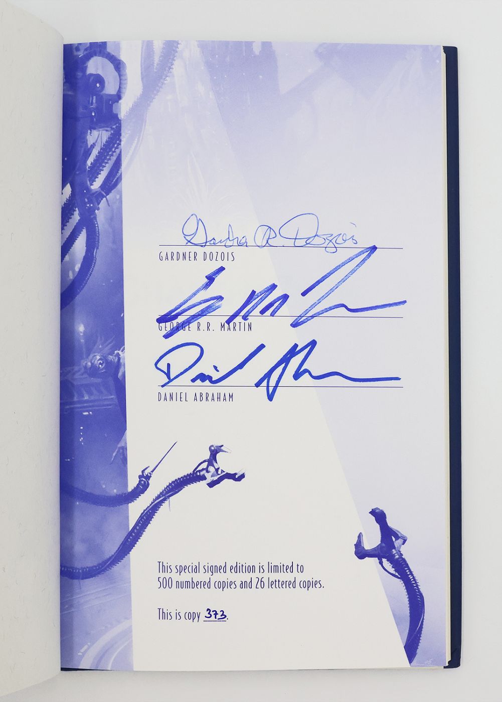 Issued in a limited edition of 500 copies, this example is numbered 373 and is signed by George R. R. Martin, Gardner Dozois and Daniel Abraham in blue ink on the limitation page. A collaboratively written science fiction novella, nearly thirty years in the making. With an afterword by all three authors.