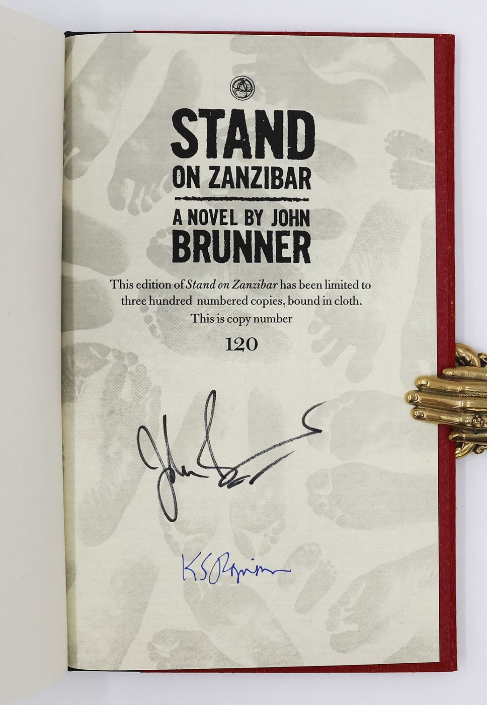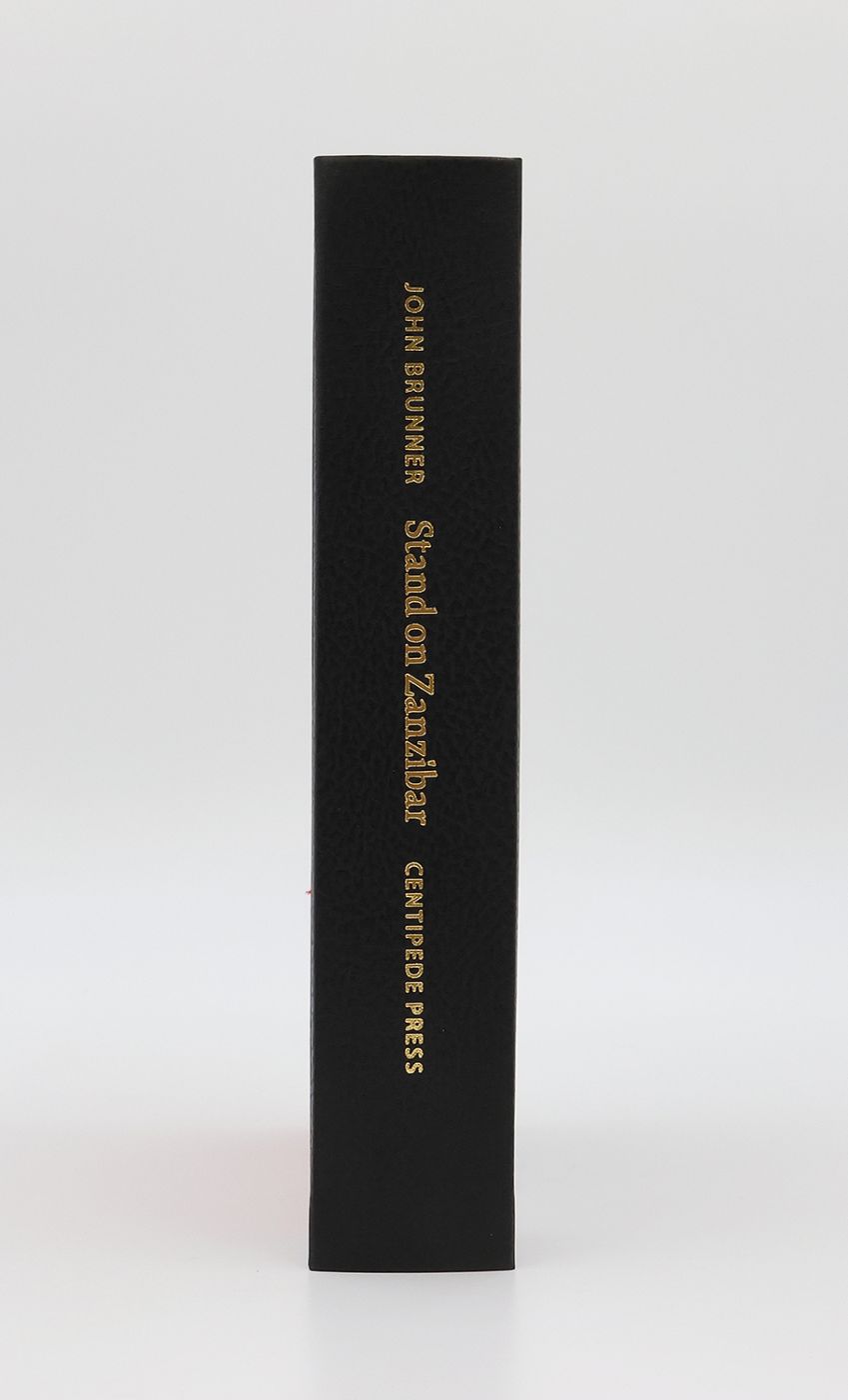Issued in an edition of 300 copies, from which this example is numbered 120, and signed by the author John Brunner and the author of the introduction Kim Stanley Robinson in black and blue ink, respectively, on the colophon. Winner of the 1969 Hugo Award for 'Best Novel' and the inaugural British SF Association Award. John Brunner (1934-1995) was a British writer focussing on general space operas in his early career but hitting his literary style with 'Stand on Zanzibar' in 1968. The fragmented narrative technique he used, delving into the lives of a vast array of characters, not simply for plot reasons, but to create a rich context for his futuristic setting, was heavily inspired by John Dos Passos' innovative 'U.S.A.' trilogy (1930-6). As with many sf writers of the era, Brunner is seen as somewhat prescient in retrospect, but his claim to fame is probably using the word 'worm' to apply to a computer virus. According to the publisher's website, before he passed away in 1995, Brunner had signed a 'few hundred' sheets as part of a project with Charles Brown (1937-2009), co-founder and editor of Locus Magazine, which sadly never saw the light of day. When Brown was told of Centipede Press' limited edition publication, he generously sent across the signed sheets to the publisher, enabling Brunner's signature to be included on the colophon at the rear.