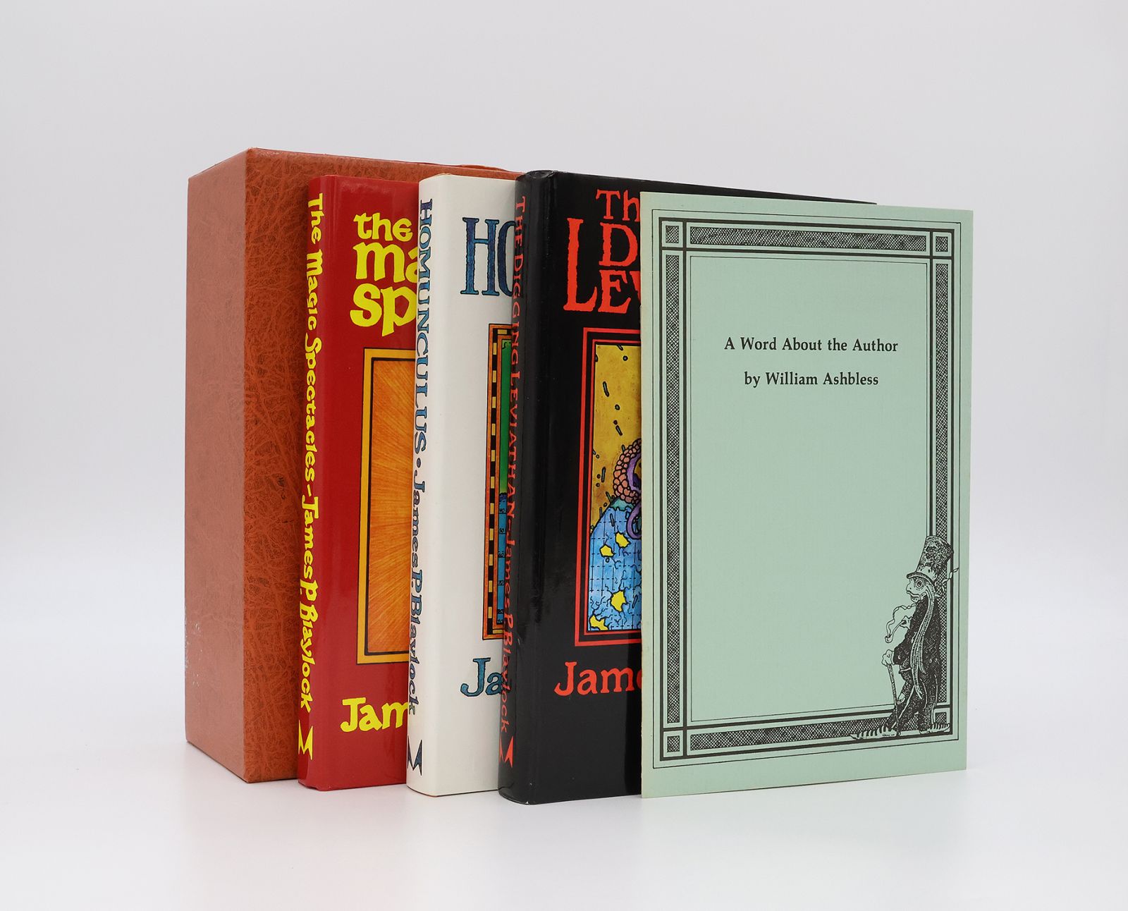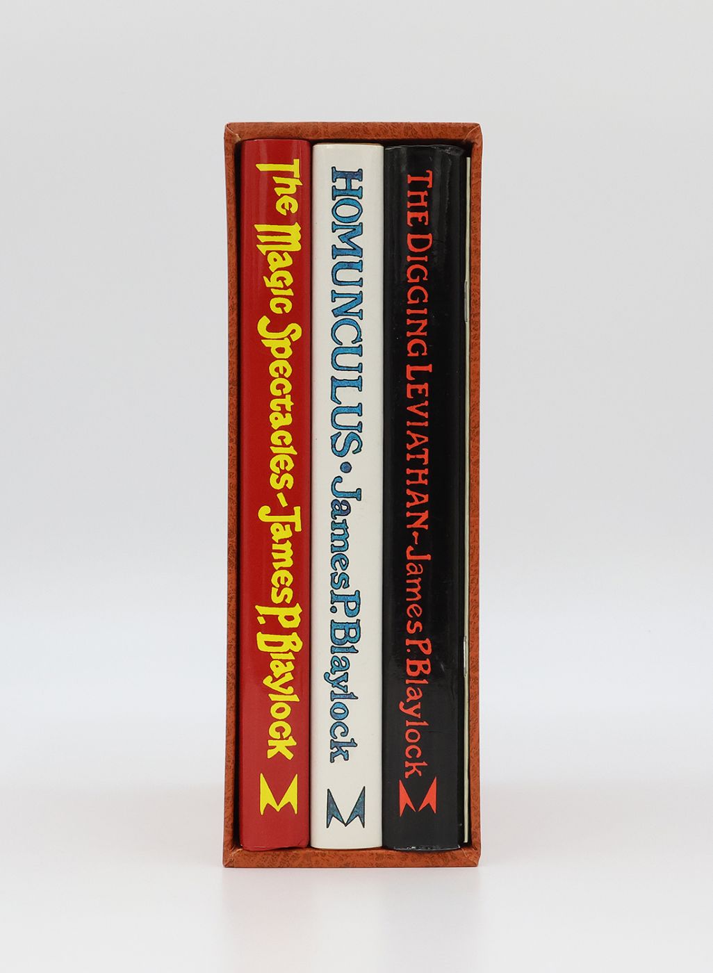 Limited edition. Signed by the author, cover artist, and contributor. Three volumes with supplementary pamphlet. Housed in orange textured faux leather slipcase. 'Homunculus' is bound in the publisher's original tan cloth with white titles to the spine, in the Ferret illustrated dustwrapper. Patterned endpapers. With nine black and white illustrations by Ferret. A fine copy, the binding square and firm, the contents are clean throughout, and without previous owners' inscriptions or stamps. Complete with the near fine original dustwrapper, which is bright and fresh, with a little spotting to the underside. Not price clipped (£40.00 to the lower front flap). 'The Digging Leviathan' is bound in the publisher's original black cloth with red titles to the spine, in the Ferret illustrated dustwrapper. With six black and white illustrations by Ferret. A near fine copy, the binding square and firm, with a little bumping to the spine tips. The contents, with a touch of spotting to the fore-edge of the text block, are clean throughout, and without previous owners' inscriptions or stamps. Complete with the lightly rubbed and creased dustwrapper, which has light spotting to the underside of the front panel and flap folds, with a small mark and a couple of spots to the underside of the upper rear flap which are visible to the printed side. Not price-clipped (£35.00 to the lower front flap). 'The Magic Spectacles' is bound in the publisher's original red cloth with yellow titles to the spine, in the Ferret illustrated dustwrapper. Patterned endpapers. With twenty black and white illustrations by Ferret. A near fine copy, the binding square and firm, with a small bump to the tail of the spine. The contents, with a touch of spotting to the fore-edge of the text block, are clean throughout, and without previous owners' inscriptions or stamps. Complete with the bright and fresh dustwrapper, which is lightly rubbed at the extremities, and with a couple of spots to the underside of the flap folds. Not price-clipped (£45.00 to the lower front flap). Together with the light green stapled card pamphlet 'A Word About The Author' by William Ashbless, black titles printed to the front panel, and black illustrations and borders printed to both panels. A near fine copy, the binding square and firm, lightly faded to the stapled fold. The contents, with the author, illustrator, and contributor's signatures on the rear endpaper and rear panel, are otherwise clean throughout, and without previous owners' inscriptions or stamps. Housed in the near fine, structurally sound slipcase, which is lightly scuffed to the spine and bottom edges.