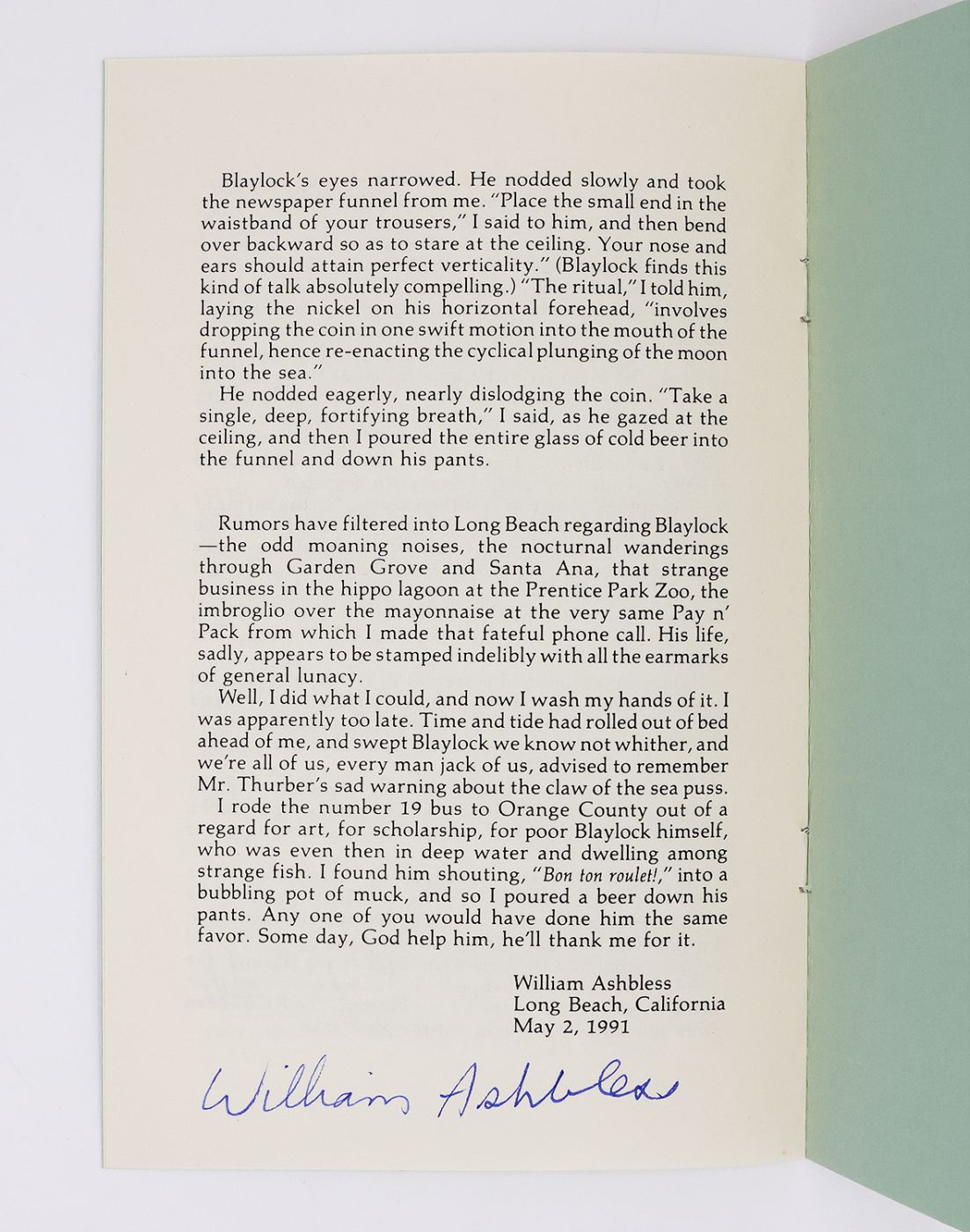 Issued in an edition of 50 copies, from which this example is numbered 23, and signed by the author James P. Blaylock and illustrator Ferret in blue and black ink, respectively, on the rear panel of the supplementary pamphlet, and by William Ashbless in black ink on the rear endpaper. Ashbless is the pseudonym for the collaborative writing of James P Blaylock and science fiction author Tim Powers, while Ferret is one of several pseudonyms used by science fiction book illustrator and author Timothy MacNamara. 'The Digging Leviathan' (1984) is the eponymous first novel in the series, set in a modern Los Angeles atop a giant underground sea. Winner of the 1988 Philip K Dick Award for best paperback original, 'Homunculus' has been described as a thematic prequel to 'Leviathan' and serves as the first volume of the Langdon St Ives sequence, a steampunk science fiction series set in a Dickensian nineteenth-century London.