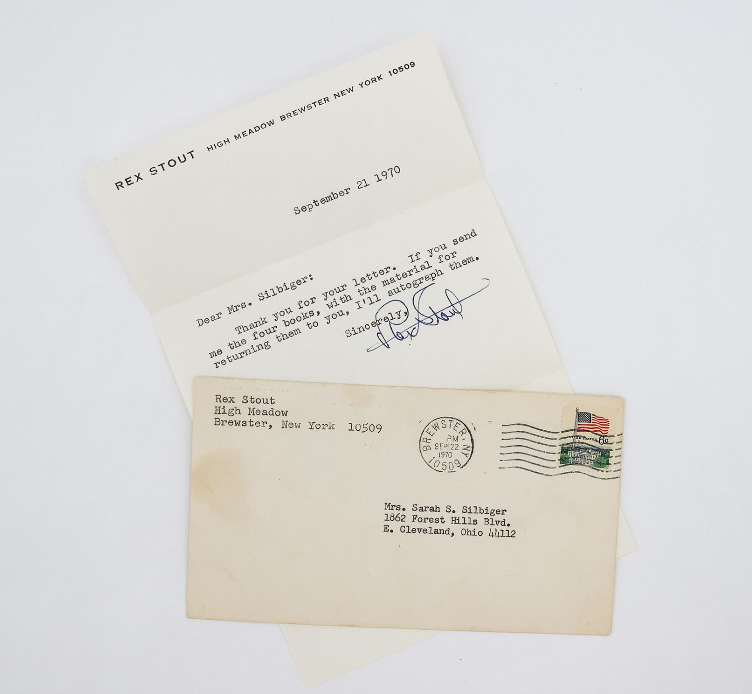 Inscribed by Rex Stout in blue ink on the half title "For Sarah S. Silbiger - / more best wishes - / Rex Stout / 10.8.70". The typed letter, dated "September 21 1970" and signed by Stout in blue ink, reads "Dear Mrs. Silbiger: / Thank you for your letter. If you send / me the four books, with the material for / returning them to you, I'll autograph them. / Sincerely, / Rex Stout". Complete with the original envelope. Rex Stout was a prolific letter-writer, whose personal correspondence spanned thousands of letters addressed to friends, editors, and several famous political figures. He accrued mountains of fan mail over the years and dutifully responded to "all but perhaps the unanswerable" (The Wolfe Pack). A considerable archive of correspondence, files, records, manuscripts, certificates, artwork, radio and television recordings, first editions and ephemera, including the research files of his official biographer John J. McAleer and bibliographer Judson C. Sapp are housed at the John J. Burns Library, Boston College in Chestnut Hill, MA.