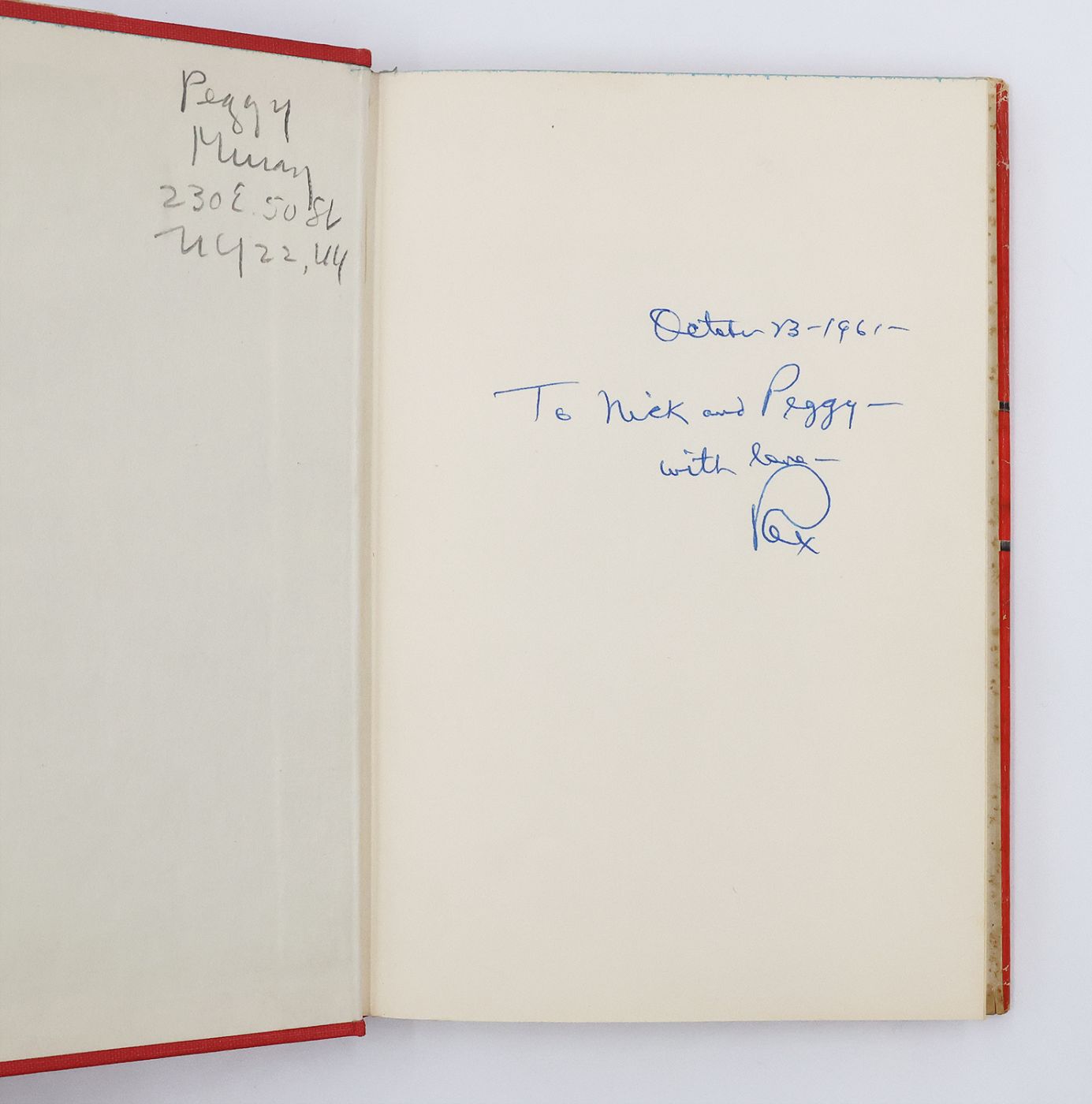 Inscribed by the author on the day of publication in blue ink on the front endpaper "October 13 - 1961 / To Nick and Peggy / with love - / Rex". The recipients are Hungarian-born American photographer and former Olympic fencer, Nickolas Muray (1892-1965) and his fourth wife Margaret (Peggy) Schwab, an amateur pilot. Hailed as one of the greatest fencers in American history and the master of the three-colour carbon print in commercial photography, Muray's professional successes, while highly impressive, have been somewhat eclipsed in the public eye by his prolific ten-year love affair and enduring friendship with Mexican artist Frida Kahlo. His colour photographs of Kahlo remain the most iconic and recognisable images of the artist, second only to her painted self-portraits. Upon ending their romance in 1941 and Muray returning to New York, he shortly married Peggy and together took up residence at 230 East 50th Street. The twenty-fourth Nero Wolfe novel. (Hubin).