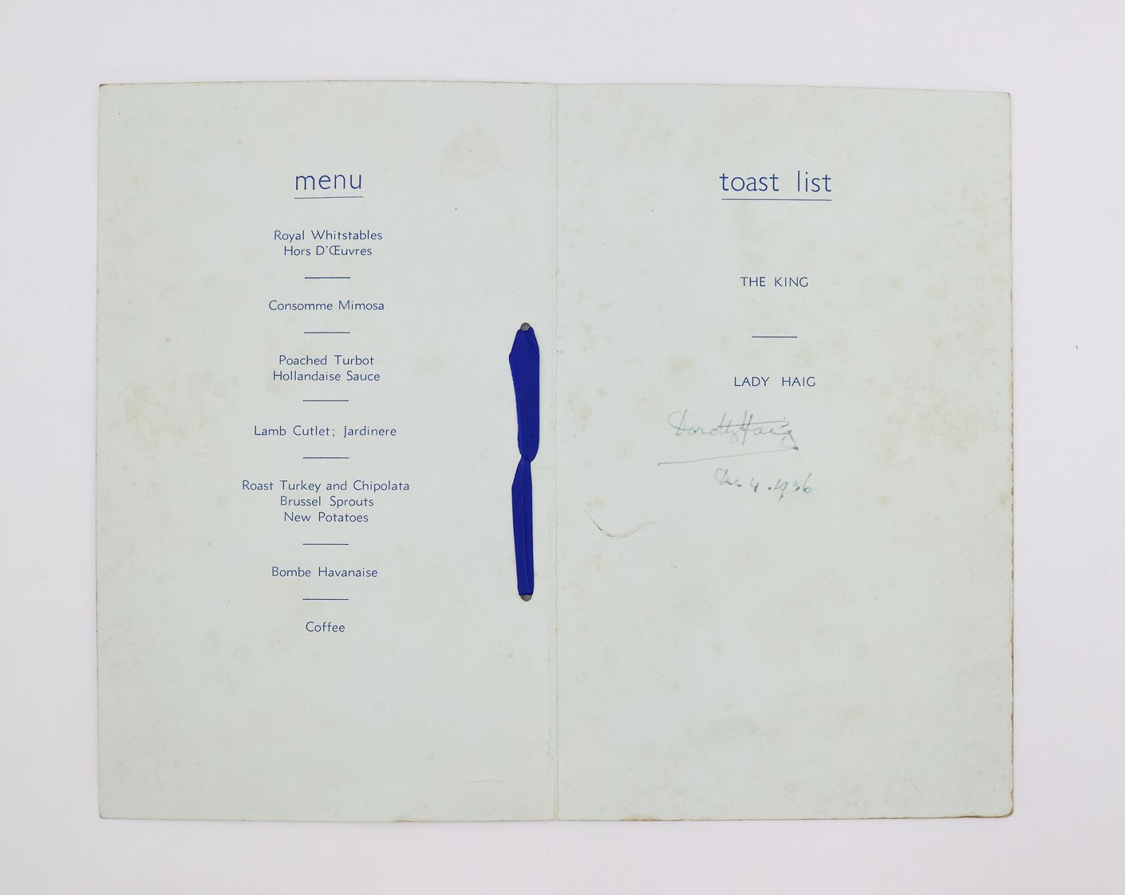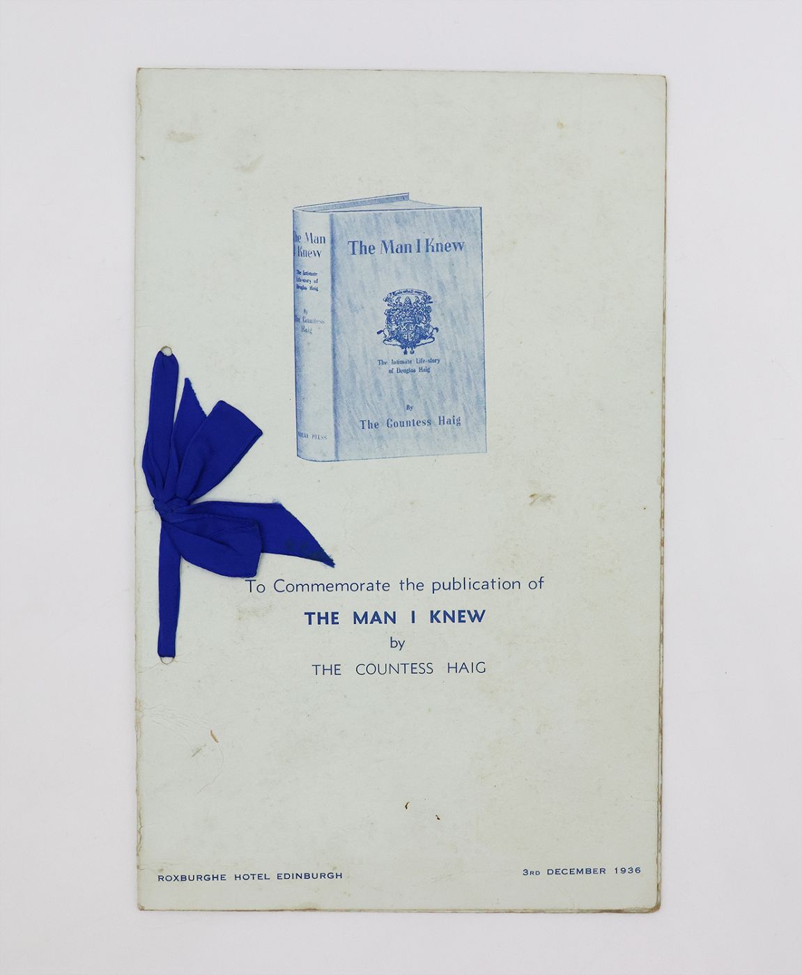 Signed by the author Countess Dorothy Maud Vivian Haig in blue ink on the title page. The original menu is also signed by Countess Haig in blue ink and dated 'Dec. 4. 1936', the day following the stated date of the dinner. Field Marshall Douglas Haig, 1st Earl Haig, (1861-1928) was a senior officer of the British Army, best known for commanding the British Expeditionary Force on the Western Front during the First World War. Nicknamed 'The Chief' by his men and 'Butcher' by the media, Haig's controversial military strategies remain the subject of much debate, particularly for their failure to break the deadlock or win significant territory despite huge casualties incurred during the battles of the Somme (1916) and Passchendaele (1917). Yet, despite his public reputation as callous, stubborn and uncharismatic, Haig's determination, diplomacy, and devotion to duty have been widely commended, with the National Army Museum characterising him as 'a man who stoically bore a burden of responsibility that would have broken lesser men'. This definitive biography, written by Haig's wife, offers fresh perspective on an iconic figure from Britain's military past, presenting 'a picture of [her] husband as a human being on the warm side of life rather than a famous man who belongs to the cold facts of history' (author's foreword).