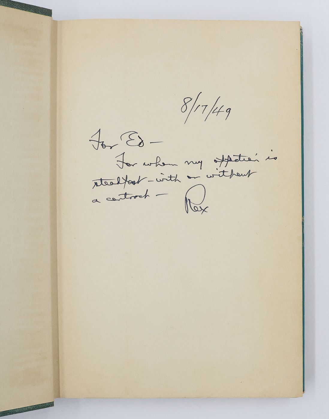 Inscribed by the author three weeks before publication in blue ink on the front endpaper "8.17.49 / For Ed / For whom my affection is / steadfast - with or without / a contract - / Rex". The recipient is Edwin Fadiman, who represented Stout's radio, screen and television interests. At the time of publication, Fadiman was in the process of producing a new 'Wolfe' radio drama series, 'The New Adventures of Nero Wolfe' (1950-1), directed by J. Donald Wilson and written by Hugo Award-winning science fiction author Alfred Bester. An earlier series 'The Adventures of Nero Wolfe' (1943-4) had ended after its second run, as a result of differences between Fadiman and producer Himan 'Hi' Brown. As per his wishes, Stout had not been consulted on the scripts, and is said to have avoided listening to Brown's series and 'wincing' at the plots, despite approving of the actors. According to Stout's official biographer John J. McAleer, the focus of Fadiman's new series centred on the characterisations instead of the plots, in keeping with the books. 'The New Aventures' spanned 26 episodes and has since been credited as the series most responsible for popularising Nero Wolfe on the radio, with its success largely attributed to the acting strength of 'Wolfe' voice actor Sydney Greenstreet, who Stout himself considered a "splendid choice" for the role. Radio is featured in the novel through the character of Paul Emerson, a controversial conservative radio commentator with a weekly broadcast, who uses his platform to ridicule Wolfe and his investigation until his employer ends his contract, forcing him off-air for good. The second of three Nero Wolfe novels that feature crime boss Arnold Zeck. [McAleer, John: Rex Stout, A Biography (1977)].