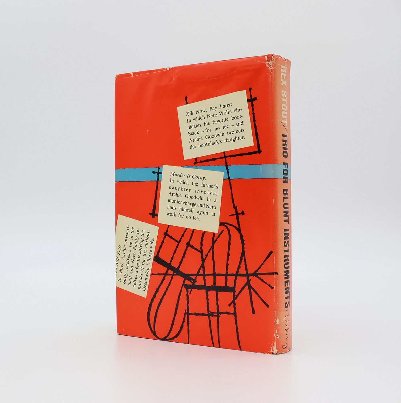 Signed by Rex Stout in blue ink on the front endpaper. The thirteenth and final collection of Nero Wolfe novellas, comprising 'Kill Now - Pay Later' (1961), 'Murder Is Corny', and 'Blood Will Tell' (1963). The previously unpublished 'Murder Is Corny' was the last 'Wolfe' novella to be written and the last to be published in Stout's lifetime. (Hubin).