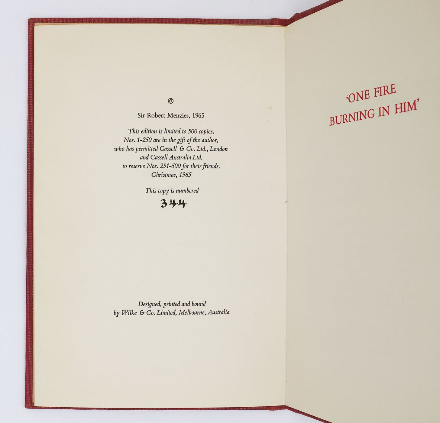 Issued in an edition of 500 copies, with numbered copies 1-250 distributed "in the gift of the author" and numbered copies 251-500 reserved for friends of the publisher. This example is numbered 344 in black ink on the limitation page. Sir Robert Menzies (1894-1978) was an Australian politician and lawyer who served as the 12th Prime Minister of Australia from 1939-1941 and again from 1949-1966. He remains the longest-serving prime minister in Australian history. Menzies was one of the twelve honorary pallbearers at the State Funeral of Sir Winston Churchill on 30th January 1965. Together with former US President Dwight D. Eisenhower, who both had known Churchill well, Menzies gave his eulogy after the funeral, speaking from the crypt of St. Paul's Cathedral, London. His touching tribute is published here.