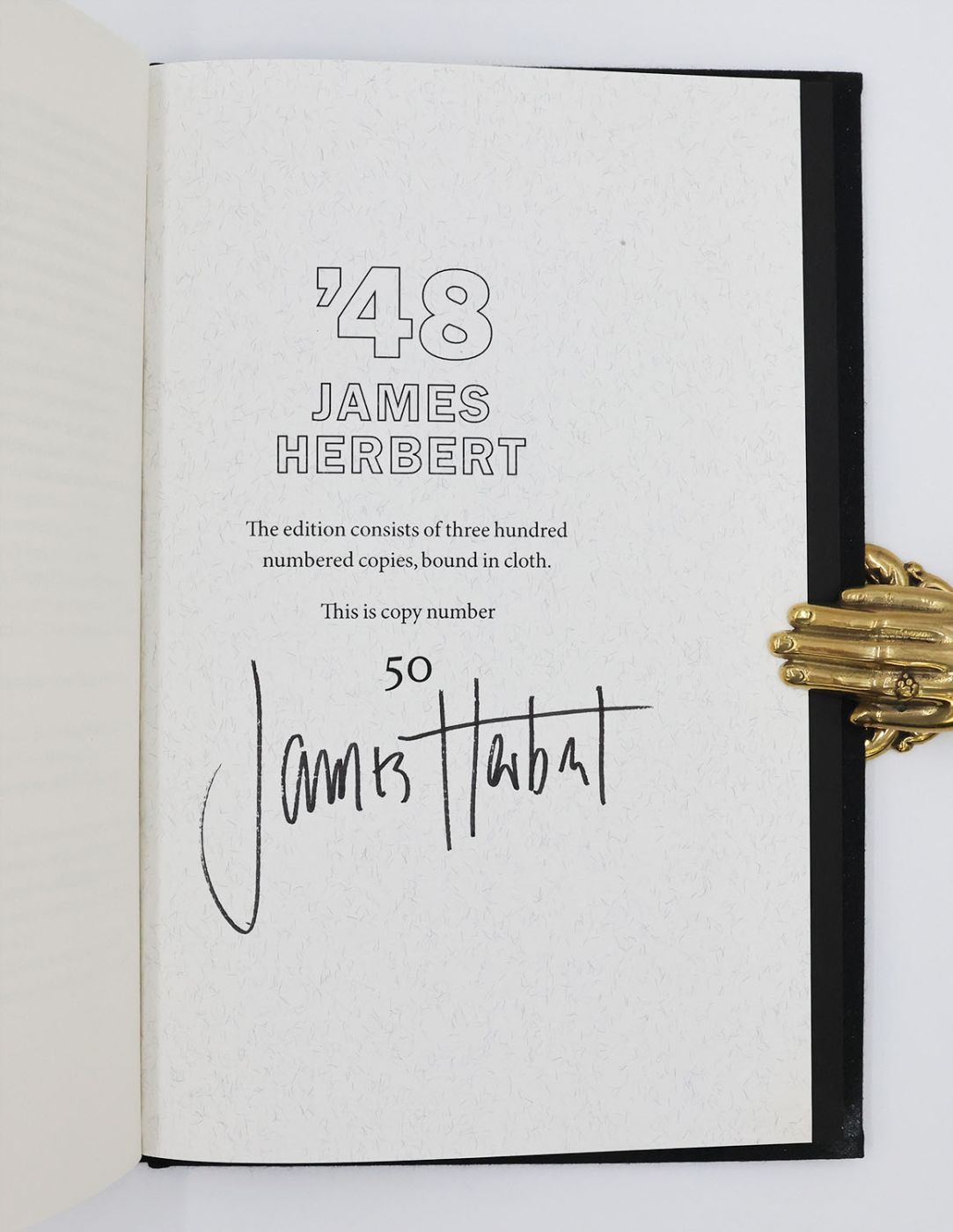 Issued in an edition of 300 copies, from which this example is numbered 50, and signed by the author James Herbert in black ink on the colophon. Best known for his horror novels 'The Fog' (1975) and 'The Dark' (1980) and the horror trilogy 'The Rats' (1974-84), Herbert here presents an alternative history novel, following an American pilot stranded in dystopian London ravaged by biological warfare. First published in 1996 by UK publisher HarperCollins.