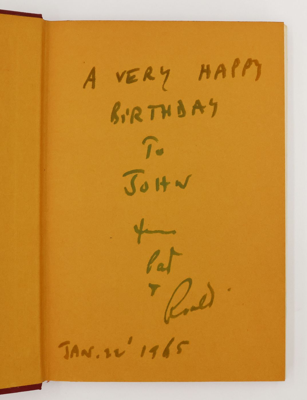 Inscribed by Roald Dahl in blue ink on the front endpaper "A VERY HAPPY / BIRTHDAY / TO JOHN / from / Pat / & / Roald / Jan. 22 1965". The recipient is John Russell (1919-2008), English art critic and journalist who at the time of presentation was a reviewer at The Times, a job secured on the recommendation of Ian Fleming with whom Russell worked in Naval Intelligence during World War II. Russell was married to the actress (later gallerist and publisher) Vera Lindsay (née Poliakoff), who was a friend of Dahl's wife Patricia Neal. A classic of 20th century children's literature and the basis for two highly successful film adaptations, the first in 1971, directed by Mel Stuart and starring Gene Wilder as Willy Wonka, the second in 2005, directed by Tim Burton and starring Johnny Depp in the lead role.