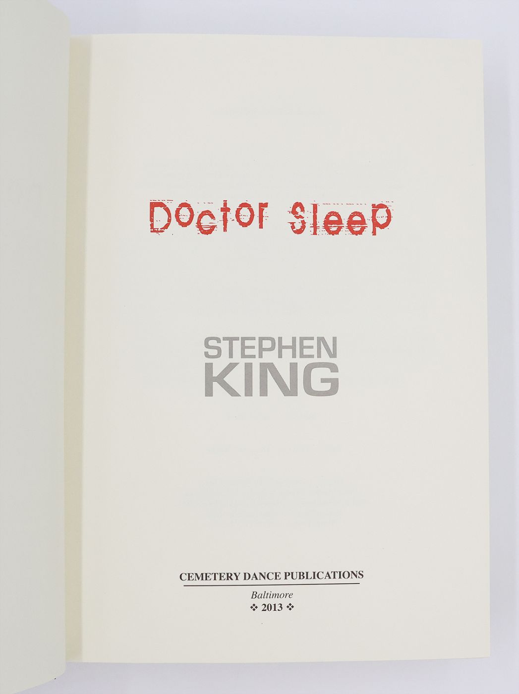 Issued in a limited 'Deluxe Slipcased Gift Edition' of 1,750 copies. The sequel to Stephen King's classic, 'The Shining', 'Doctor Sleep' won the 2014 Bram Stoker Award and was adapted for film in 2019, starring Ewan McGregor in the role of Dan Torrance and Kyliegh Curran as Abra Stone.