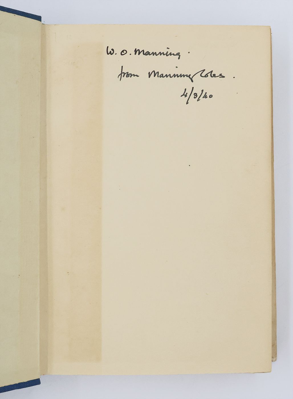 Inscribed in blue ink on the front free endpaper, in the hand of Adelaide Manning "W. O. Manning / from / Manning Coles / 4.9.40." The recipient, William Oke Manning, the author's elder brother, was a pioneering figure in British aeronautical design. This is the debut novel of the crime-writing partnership of Adelaide Manning and Cyril Coles, published under the pseudonym 'Manning Coles'. It introduces the master spy Tommy Hambledon, who would go on to appear in a further twenty-five novels over the next two decades. A Haycraft–Queen Cornerstone title.