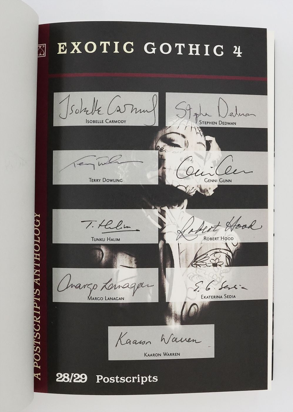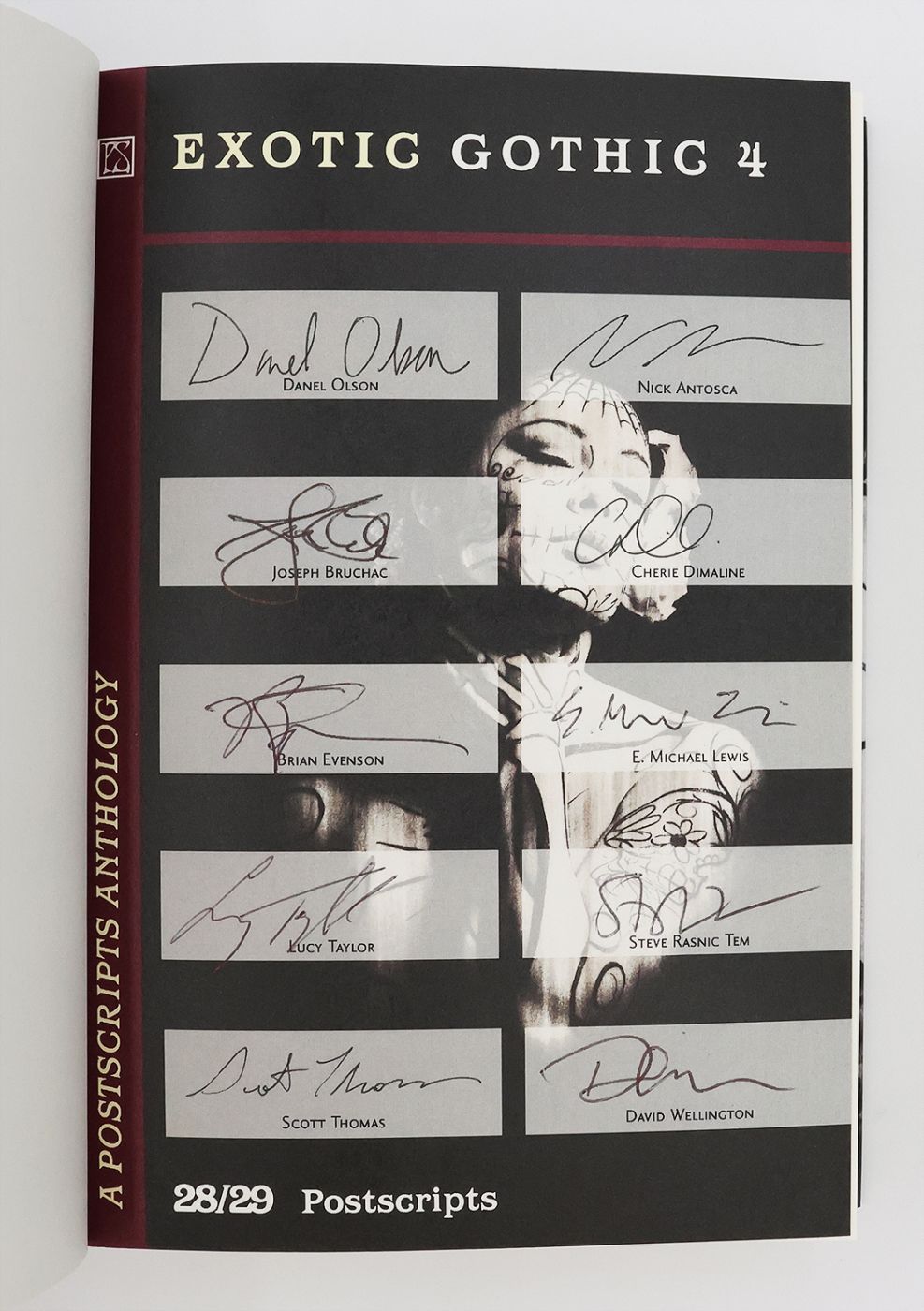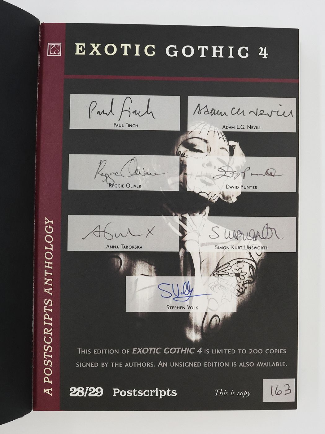 Issued in an edition of 200 copies, from which this example is numbered 163, and signed by the authors Paul Finch, Adam L. G. Nevill, Reggie Oliver, David Punter, Anna Taborska, Simon Kurt Unsworth, Stephen Volk, Nick Antosca, Joseph Brucchac, Cherie Dimaline, Brian Evenson, E. Michael Lewis, Lucy Taylor, Steve Rasnic Tem, Scott Thomas, David Wellington, Isobelle Carmody, Stephen Dedman, Terry Dowling, Genni Gunn, Tunku Halim, Robert Hood, Margo Lanagan, Ekaterina Sedia, Kaaron Warren, and the editor Danel Olson, in black and blue ink on the limitation pages at the front. Edited by Danel Olson, World Fantasy Award-winning editor, Gothic literature scholar and creator of the 'New Gothic' anthology series, 'Exotic Gothic 4' comprises the twenty-eighth and twenty-ninth issues of Postscripts in the publisher's hardback science fiction anthology series. A compilation of 25 science fiction novelettes and short stories, subdivided geographically. Winner of the 2013 World Fantasy Award and Shirley Jackson Award for 'Best Edited Anthology'.