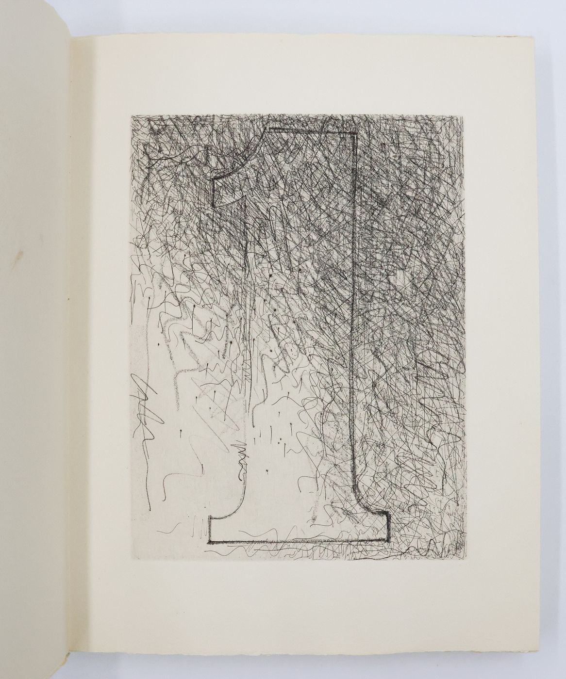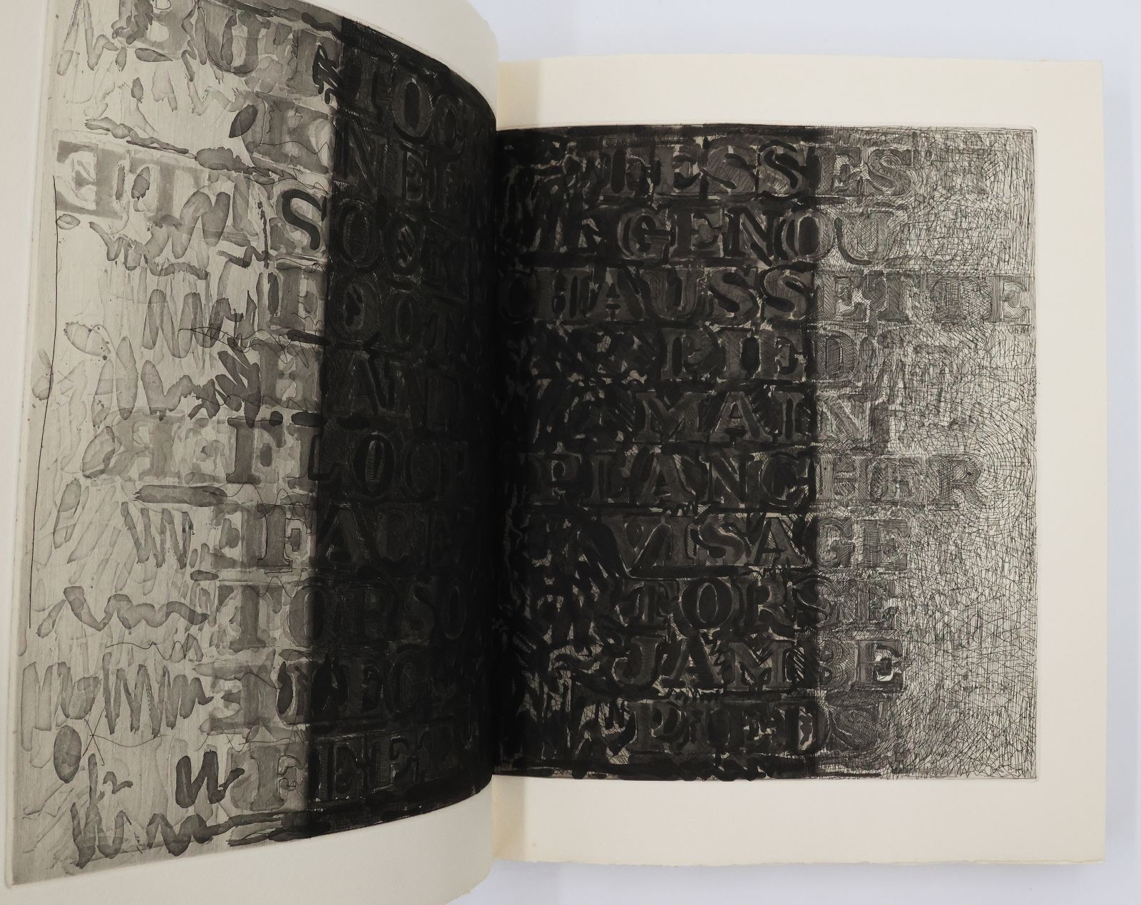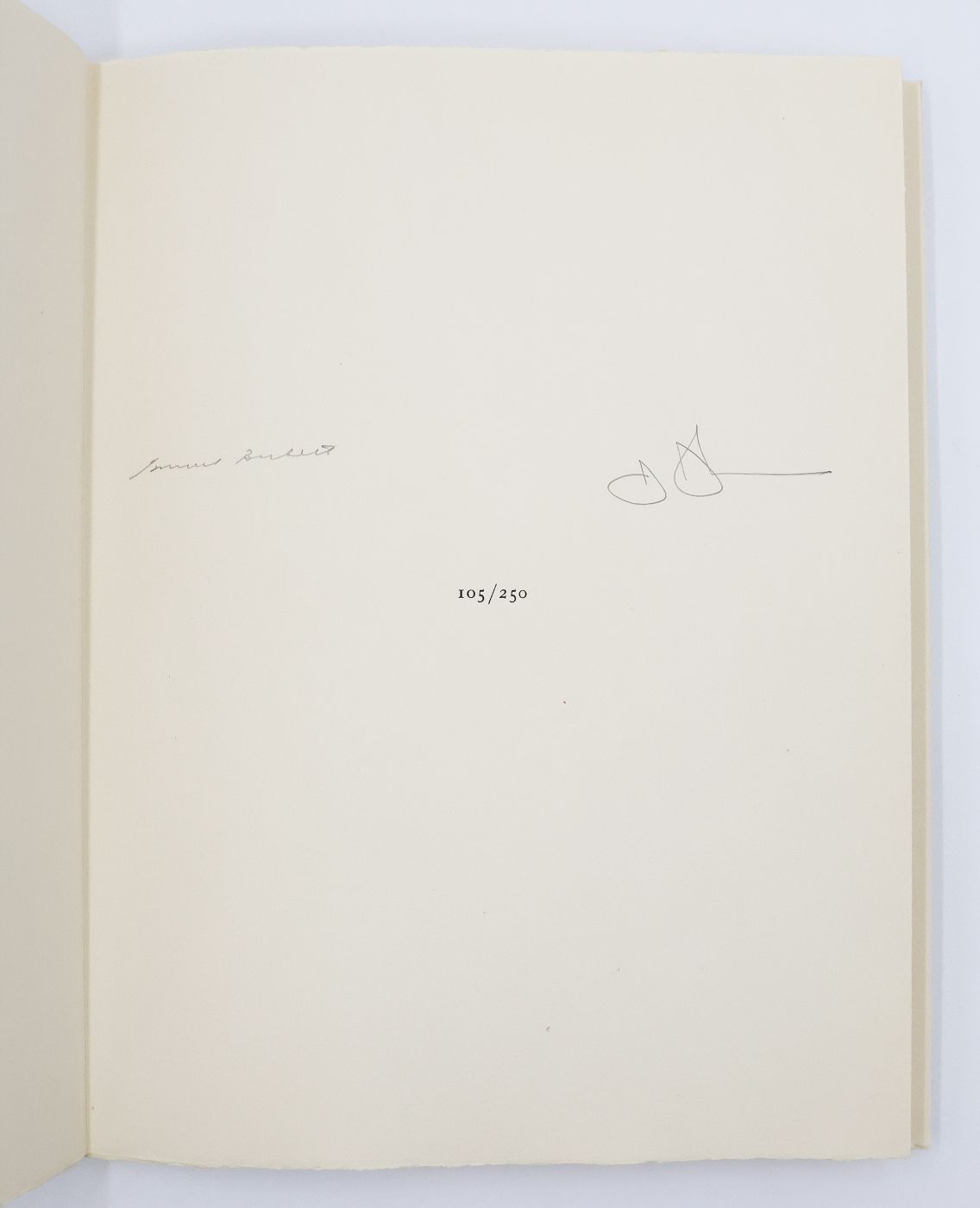 First edition. Signed by the author and the artist. Limited edition. "This cerebral volume that provokes more questions than it answers is considered one of the greatest artists' books of the second half of the twentieth century" (Johnson and Stein: Artists' Books in the Modern Era 1870-2000). Complete. Five texts by Samuel Beckett in both French and English. Illustrated with 33 etchings by Johns (including 26 lift-ground aquatints, five etchings with mixed media, one soft-ground etching, and one aquatint), together with two colour lithographs used as endpapers. Tissue guards present. The plates were drawn by Johns and proofed and printed by hand at the Atelier Crommelynck in Paris between 1975 and 1976. The paper, watermarked with Beckett's initials and Johns' signature, was handmade by Richard de Bas in the Auvergne. The type, set in Caslon Old Face 16-point, was hand-printed by Fequet and Baudier in Paris. Housed in the original grey linen portfolio case with purple silk tassel, the interior lined with a colour lithograph. A fine copy. The binding square, clean and bright. The contents, with some offsetting from a couple of the darker plates to the opposite page (as in all copies seen), are bright and fresh throughout.
