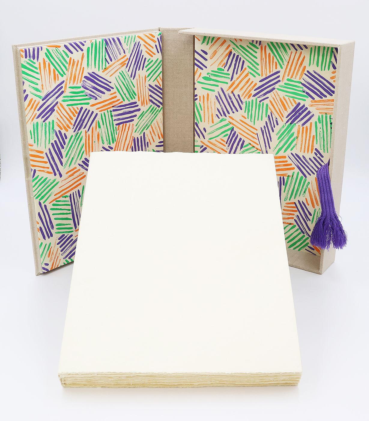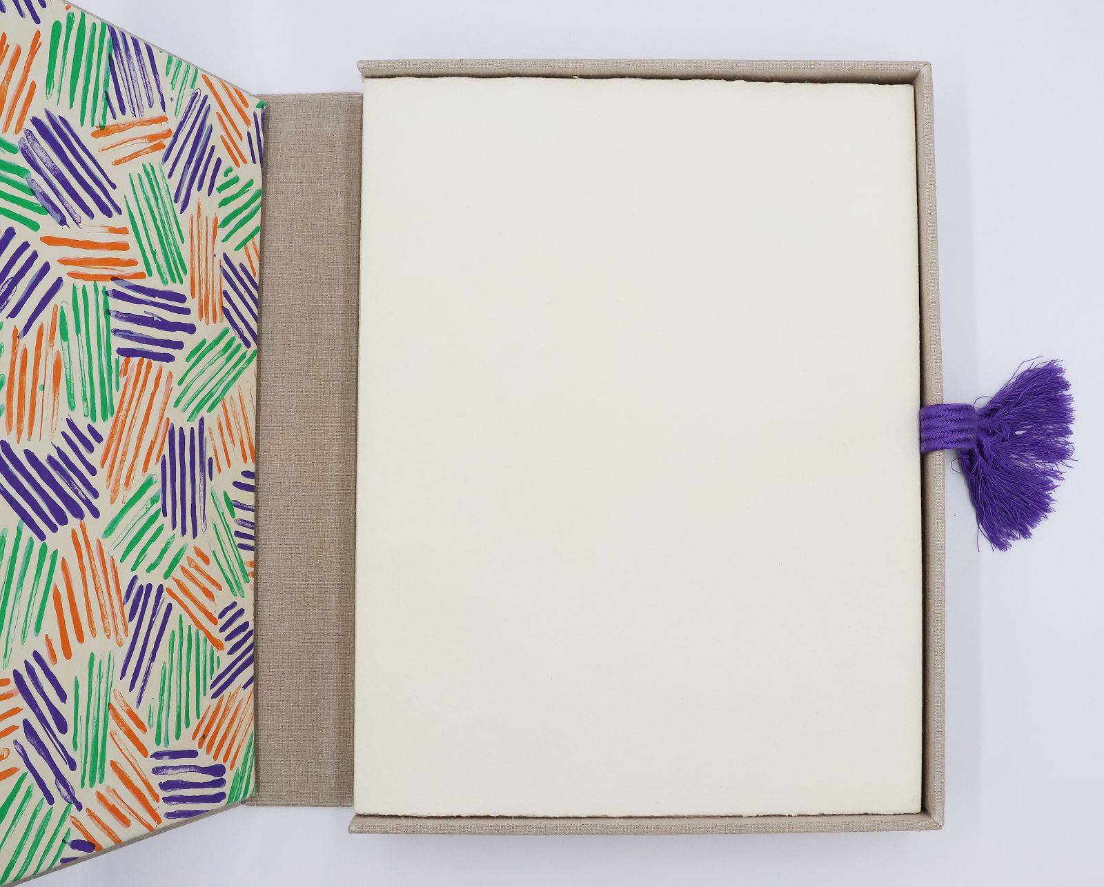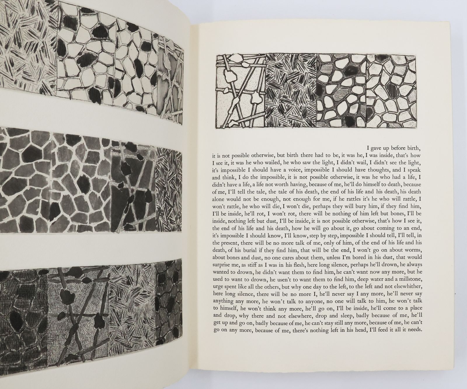 First edition. Signed by the author and the artist. Limited edition. "This cerebral volume that provokes more questions than it answers is considered one of the greatest artists' books of the second half of the twentieth century" (Johnson and Stein: Artists' Books in the Modern Era 1870-2000). Complete. Five texts by Samuel Beckett in both French and English. Illustrated with 33 etchings by Johns (including 26 lift-ground aquatints, five etchings with mixed media, one soft-ground etching, and one aquatint), together with two colour lithographs used as endpapers. Tissue guards present. The plates were drawn by Johns and proofed and printed by hand at the Atelier Crommelynck in Paris between 1975 and 1976. The paper, watermarked with Beckett's initials and Johns' signature, was handmade by Richard de Bas in the Auvergne. The type, set in Caslon Old Face 16-point, was hand-printed by Fequet and Baudier in Paris. Housed in the original grey linen portfolio case with purple silk tassel, the interior lined with a colour lithograph. A fine copy. The binding square, clean and bright. The contents, with some offsetting from a couple of the darker plates to the opposite page (as in all copies seen), are bright and fresh throughout.