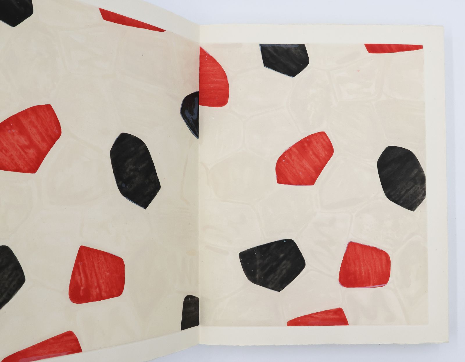 Issued in a limited edition of 250 copies, this example is numbered 105 and signed by Samuel Beckett and Jasper Johns on the limitation page. The five prose texts that comprise Foirades were written by Samuel Beckett in French in 1972 and translated into English by the author in 1974 specifically for this collaborative publication. In response, Jasper Johns produced a suite of 33 etchings derived from his four-panel painting Untitled (1972), now held in the collection of Museum Ludwig in Cologne. As the critic Christian Geelhaar noted, Johns had already developed "a set of images unsurpassed in their intuitive realisation of Beckett's texts", despite not yet having read them. The four panels introduced imagery new to Johns' practice. The left panel features a field of stripes or cross-hatching, recalling markings he once observed on a car passing along the Long Island Expressway. The two central panels derive from a wall he had seen on a building in Harlem, painted with rock-like forms in red, white and black. The final panel incorporates wax casts of fragmented body parts affixed to wooden boards. These motifs are developed across the prints through combinations of etching, aquatint and drypoint, rendered predominantly in black and grey. Johns' characteristic stencilled numerals precede each of Beckett's texts, while the endpapers, depicting cross-hatching and rock or flagstone imagery, are printed in colour. The project also marked a technical shift in the artist's printmaking practice. Having previously worked largely in lithography, he was encouraged by Paul Cornwall-Jones, founder of Petersburg Press, to experiment with etching. Cornwall-Jones introduced Johns to the master printer Aldo Crommelynck, who had collaborated almost exclusively with Pablo Picasso during the previous decade. Following Picasso's death in 1973, Crommelynck's Paris studio became a centre for artists associated with Petersburg Press, including Richard Hamilton, David Hockney, Howard Hodgkin and Jim Dine. Johns first visited the studio in 1974, and their collaboration over the next two years resulted in the extraordinary etchings encountered here.