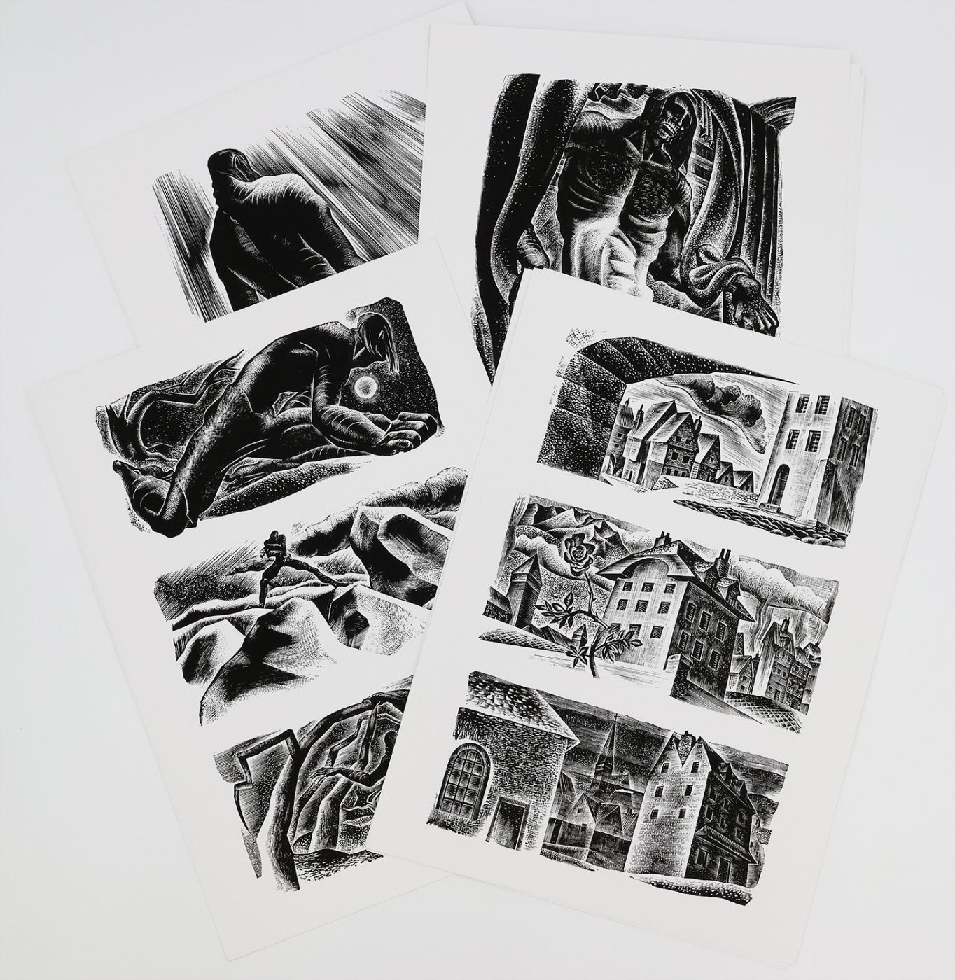 First edition thus. Deluxe edition, one of 22 copies. Folio. Publisher's black morocco backed red cloth boards illustrated in black. Red ribbon page marker. Illustrated with wood engravings, full page and throughout the text by Lynd Ward. A fine copy, the binding square and firm, bright and fresh. The contents are clean throughout and without previous owners' marks. With a separate black cloth portfolio containing the complete suite of lose wood engravings by Lynd Ward, in fine condition. Both volumes housed in the publisher's black leather solander case with titles in gilt to the spine. The case, whilst a little rubbed and scuffed to the surface edges of the soft leather, remains in very good, structurally sound condition.