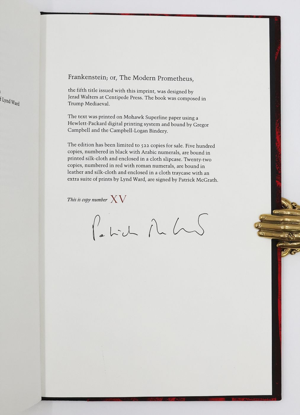 Issued in a deluxe edition of just 22 copies, this example is numbered XV and signed by Patrick McGrath in black ink on the colophon of the book. The fifth Centipede Press publication. The book alone, without the extra suite of wood-engravings and large solander box, was also issued in an edition of 500 copies. Lynd Ward's illustrations for Mary Shelley's masterpiece of gothic horror and science fiction were first published in 1934 by Harrison Smith and Robert Haas, New York.