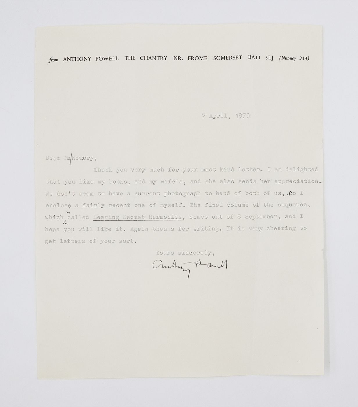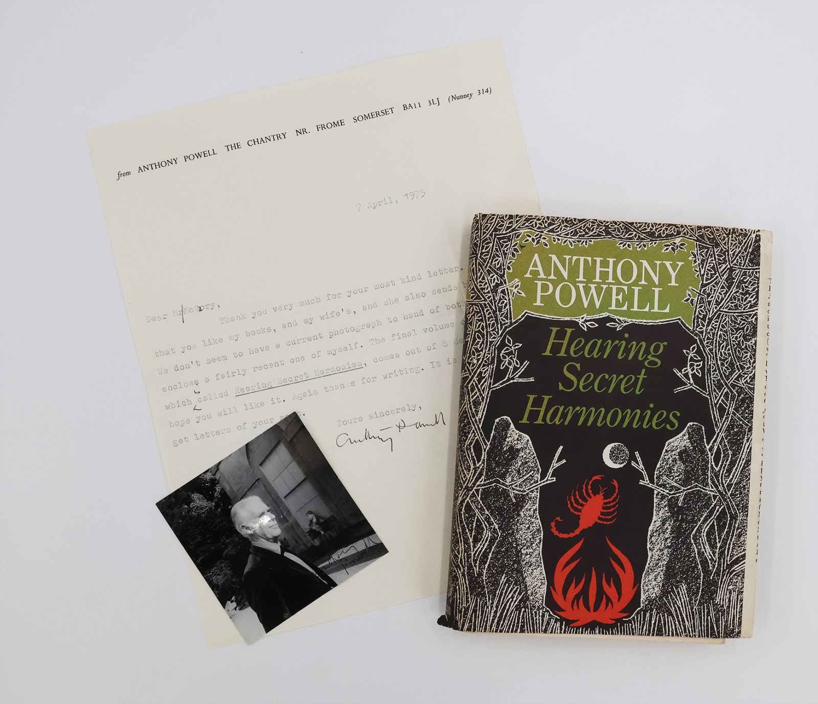 The twelfth and final volume in the author's A Dance To The Music of Time series. The first printing was issued in an edition of 13,000 copies. Loosely laid in is a typed letter with autograph emendations from the author, dated 7 April 1975 address to a Mr. McGory, thanking him for his letter and appreciation of his, and his wife's (Lady Violet Powell) books and enclosing a signed black and white photograph of himself. Powell goes on to mention that the "final volume of the sequence, which is called Hearing Secret Harmonies', comes out of 8 September, and I hope you will like it". The letter is signed in black ink and the photograph is signed in blue. (Lilley A22a).
