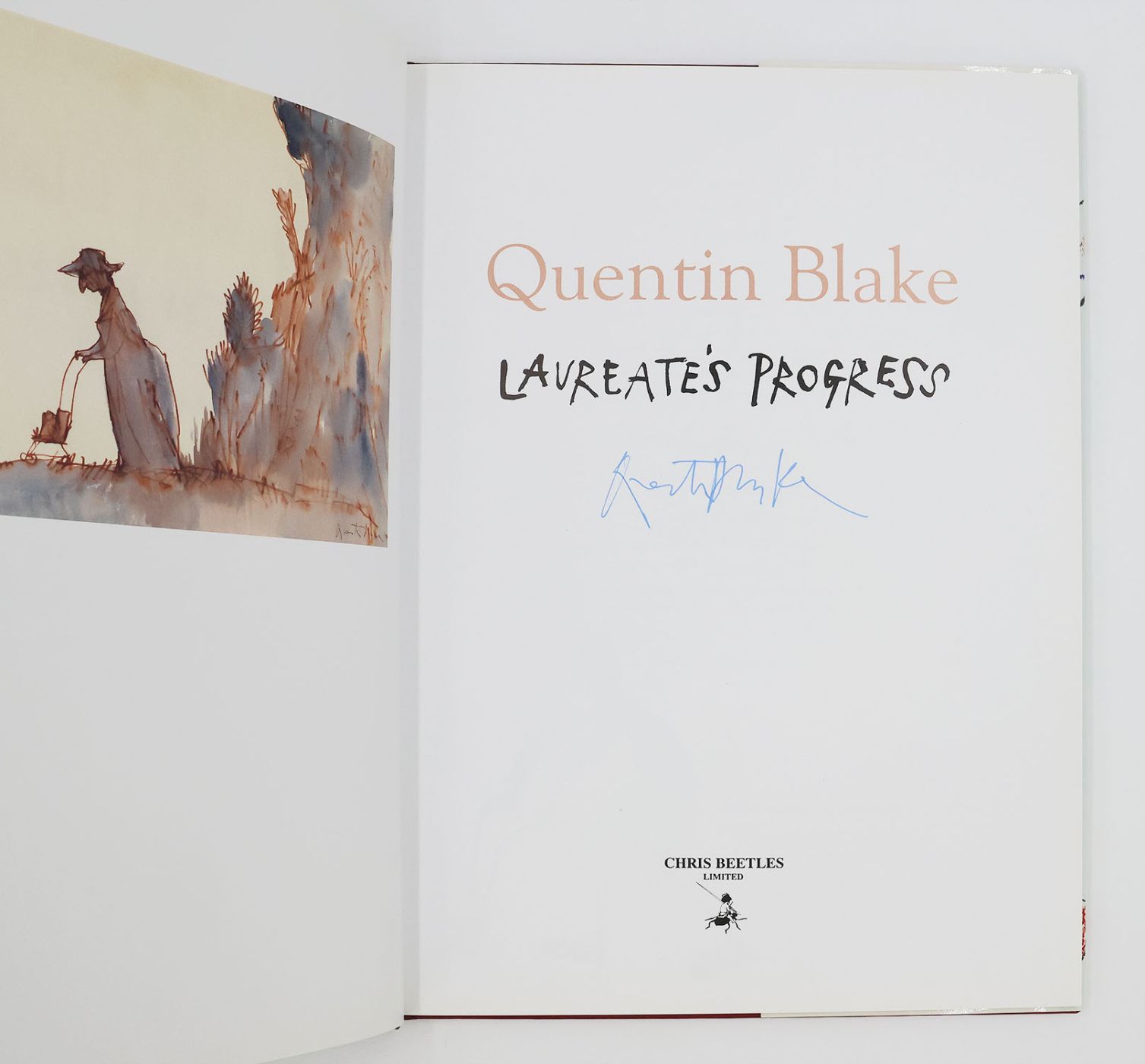 Signed by Quentin Blake in blue ink on the title page. Quentin Blake's own account of his two year tenure as the first Children's Laureate (1999-2001). Issued in an edition of 1000 copies for the Chris Beetles Gallery. A folded card advertisement is loosely laid in, advertising the Quentin Blake 'Laureate's Progress' exhibition, which took place from Monday 4th - Saturday 9th November 2002, and two other exclusive events organised by the publisher celebrating the exhibition and concurrent release of the book.