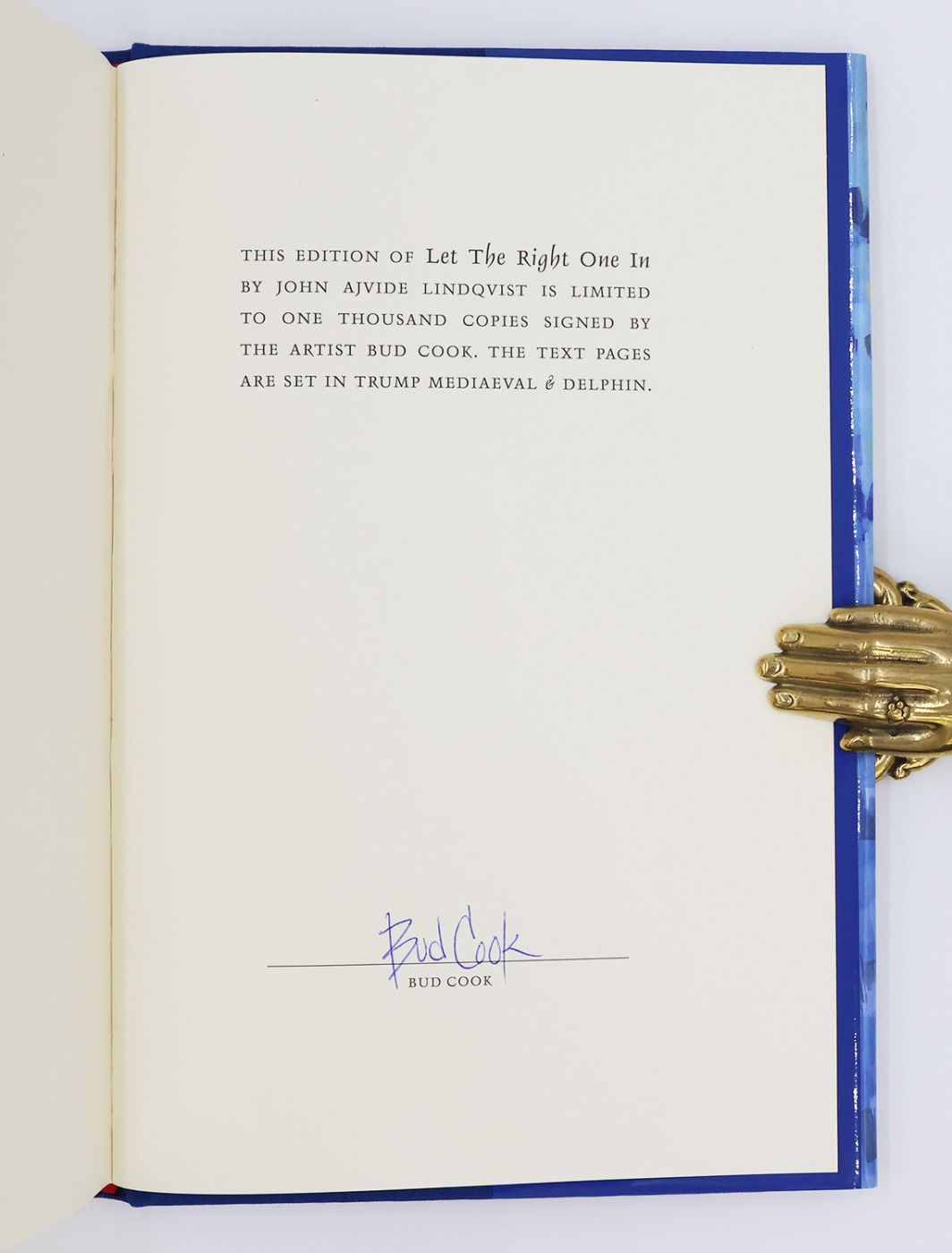 Issued in a limited edition of 1000 copies, signed by Bud Cook in blue ink on the limitation page. With a new introduction by the author. A beautifully produced deluxe edition of the author's debut novel, a dark and atmospheric vampire tale meets coming-of-age story set in suburban Sweden. It has been adapted for film twice, the first being a Swedish language film of the same name directed by Tomas Alfredson and released in 2008, the second an American production titled 'Let Me In' directed by Matt Reeves and starring Chloe Grace Moretz that was released in 2010. It has also been adapted for television and stage.