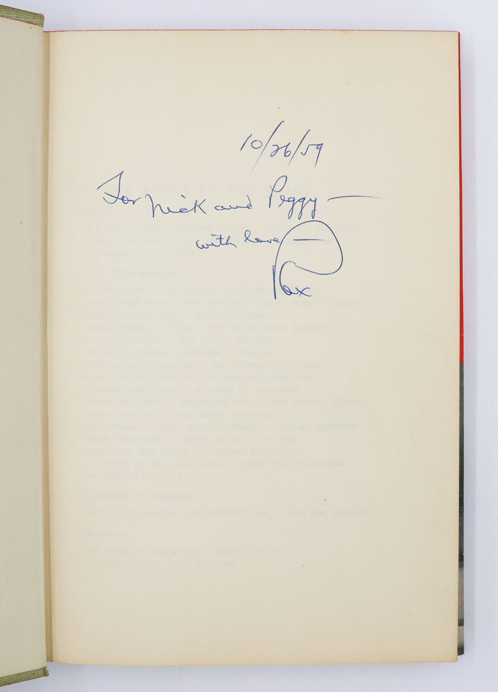 Inscribed by the author, four days before publication, in blue ink on the front endpaper "10.26.59 / For Nick and Peggy - / with love - / Rex". The recipients are Hungarian-born American photographer and former Olympic fencer, Nickolas Muray (1892-1965) and his fourth wife Margaret (Peggy) Schwab, an amateur pilot. Hailed as one of the greatest fencers in American history and the master of the three-colour carbon print in commercial photography, Muray's professional successes, while highly impressive, have been somewhat eclipsed in the public eye by his prolific ten-year love affair and enduring friendship with Mexican artist Frida Kahlo. His colour photographs of Kahlo remain the most iconic and recognisable images of the artist, second only to her painted self-portraits. A biblio-mystery. Published 30 October 1959. The first UK edition, published by Collins, The Crime Club, followed in August 1960. (Hubin).