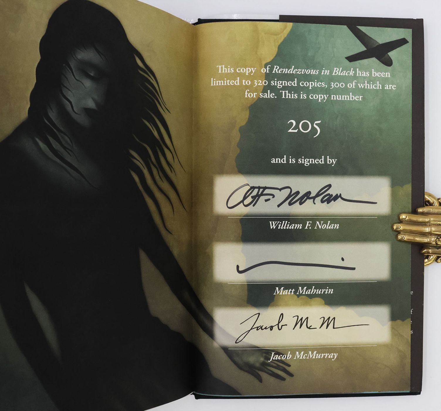 Issued in an edition of 300 copies, this example is numbered 205 and signed by the illustrators Matt Mahurin and Jacob McMurray and by the author of the introduction William F. Nolan in black ink on the colophon. 'Rendezvous in Black' was first published in 1948 by Rinehart & Company, New York. One of six volumes included in the Cornell Woolrich 'Black' series released by Centipede Press in 2015. Other books in this series are: 'Black Alibi', 'The Black Angel', 'The Black Curtain', 'The Black Path of Fear', and 'The Bride Wore Black'.