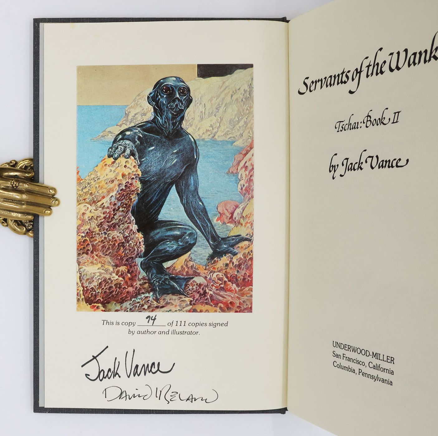 Issued in an edition of 111 copies, from which this example is numbered 94, and signed by the author Jack Vance and illustrator David Ireland in black ink on the limitation page. The second book in Vance's 'Planet of Adventure' series, relating the adventures of Adam Reith, sole survivor of an Earth ship investigating a signal from the distant planet Tschai. Although the novels are thematically linked, each is a self-contained story. When the series was included in the 44 volume Integral Edition of Vance's works (1999-2006), the editors altered the title of the second volume to 'The Wannek'. The author was persuaded to make the change upon learning the meaning of the phonetically identical British demotic term (the offending word was replaced throughout the text).