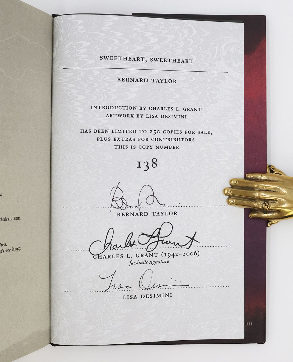 Issued in a limited edition of 250 copies, this example is numbered 138 and is signed by Bernard Taylor and Lisa Desimini in black ink on the limitation page. A gothic haunted house novel first published in 1977 by Souvenir Press. Described by the World Fantasy Award winning writer Charles L. Grant as "the best ghost story... I have ever read, and am ever likely to read".
