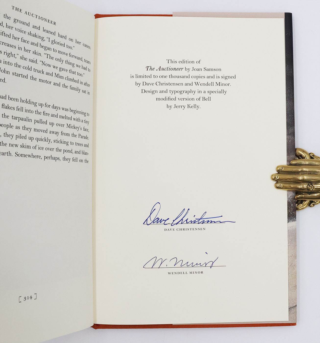 The 'Artist edition', issued in an edition of 1000 copies, signed by the illustrator Dave Christensen and dustwrapper artist Wendell Minor in blue ink on the colophon. Joan Samson's debut novel was published to wide acclaim in 1975, with intentions to turn the novel into a film. Soon after publication Joan Samson passed away and 'The Auctioneer' went out of print soon after. In 2007 Centipede Press republished the novel for the first time in 30 years.