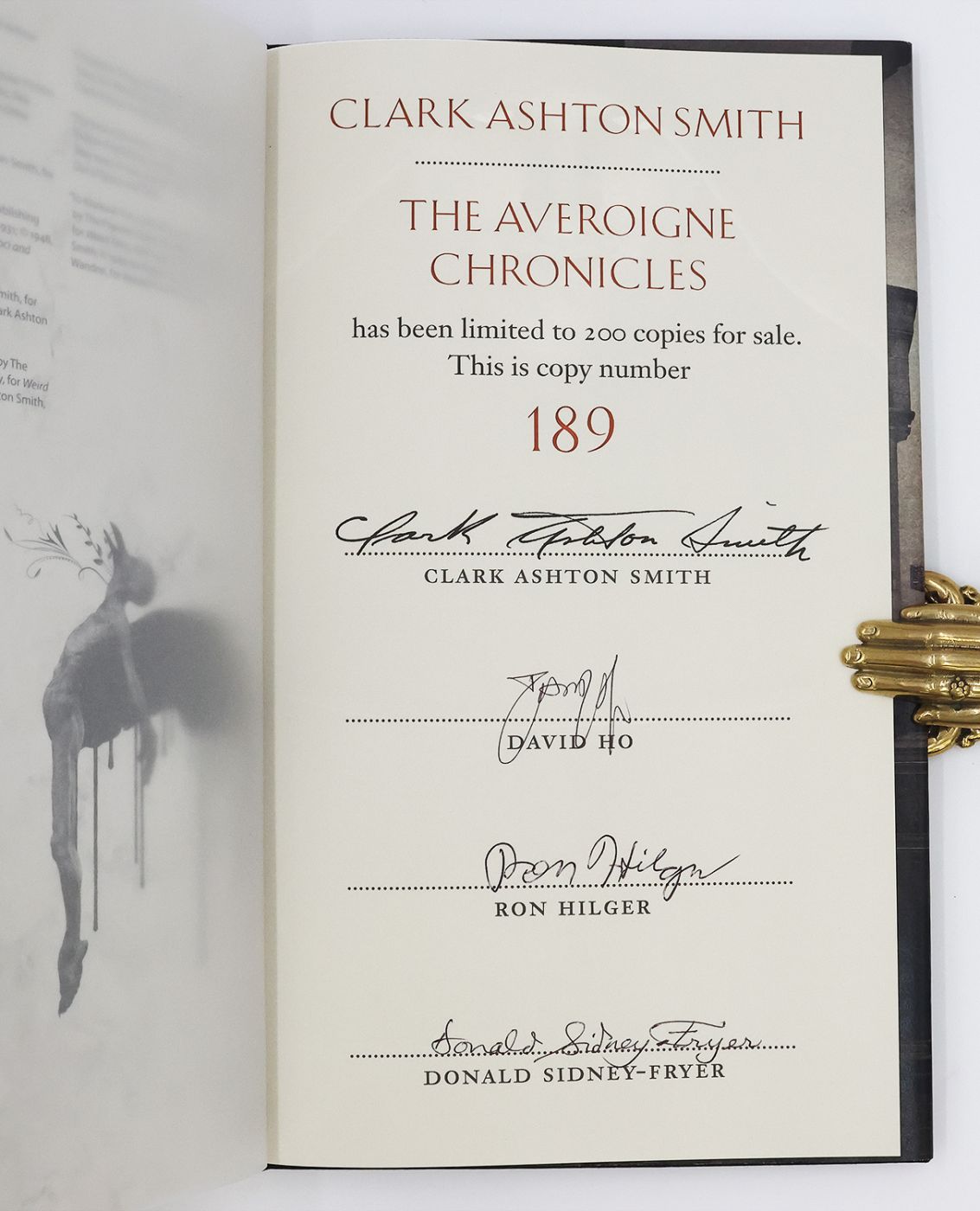 Issued in a limited edition of 200 copies, this example is numbered 189 and signed by the illustrator David Ho, editor Ron Hilger and author of the afterword Donald Sidney-Fryer in black ink on the colophon. The colophon also contains the facsimile signature of Clark Ashton Smith. Comprising 'A Night in Malneant', 'The Maker of Gargoyles', 'The Holiness of Azedarac', 'The Colossus of Ylourgne', 'The Enchantress of Sylaire', 'The Beast of Averoigne', 'Mother of Toads', 'A Rendezvous in Averoigne', 'The Mandrakes', 'The Satyr', 'The Disinterment of Venus' and 'The End of The Story'.