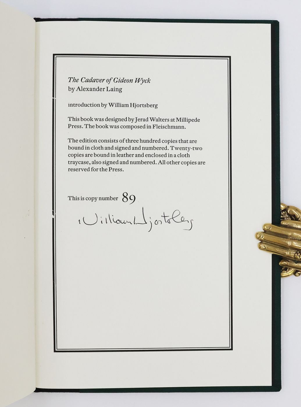 Issued in an edition of 300 copies, from which this example is numbered 89 and signed by William Hjortsberg in black ink on the colophon. 'The Cadaver of Gideon Wyck', now a classic of crime and horror fiction, was first published in 1934 by Farrar and Rinehart, Inc. New York. This limited edition includes three bonus essays, here collected for the first time: 'On Language as a Social Art', 'The Use of History', and 'Words in Sheep's Clothing'. This is the complete and unabridged edition of the novel, which includes Laing's extensive footnotes that discuss, among others, the history of medical abnormalities.