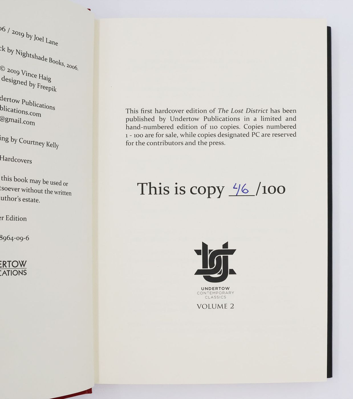 Issued in an edition of 100 copies, from which this example is numbered 46. A collection of horror and fantasy short stories by two-time British Fantasy Award-winner Joel Lane, 'The Lost District' was first published in 2006 by Nightshade Books (San Francisco, CA) in trade paperback form. This example is the First Hardcover Edition.