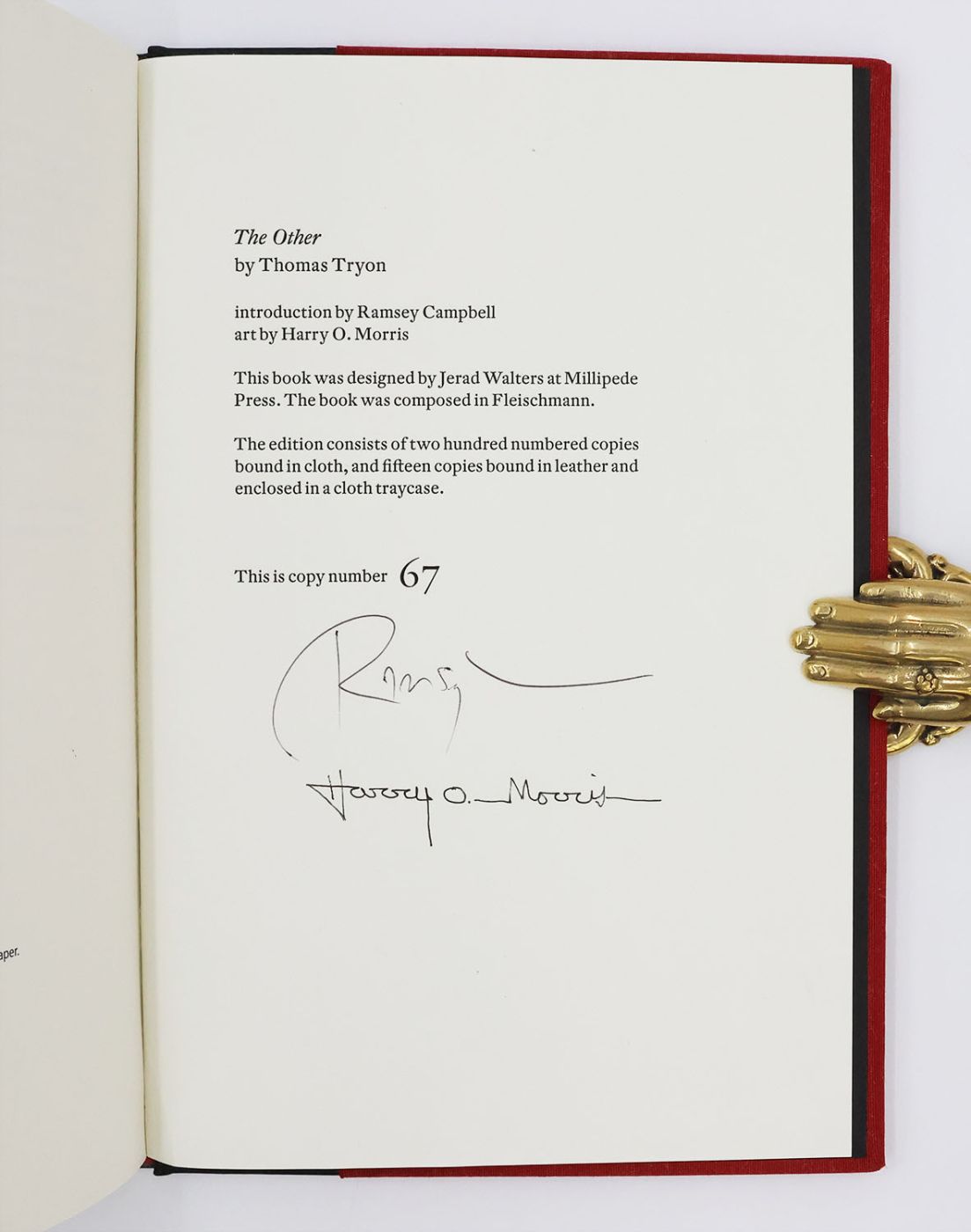 Issued in an edition of 200 copies, from which this example is numbered 67 and signed by the illustrator Harry O. Morris and the author of the introduction Ramsey Campbell in black ink on the colophon. Thomas Tyron's debut novel 'The Other' was first published in 1971 by Alfred A. Knopf, New York. A surprise bestseller, it was adapted into the 1972 film of the same name directed by Robert Mulligan and starring Uta Hagen.
