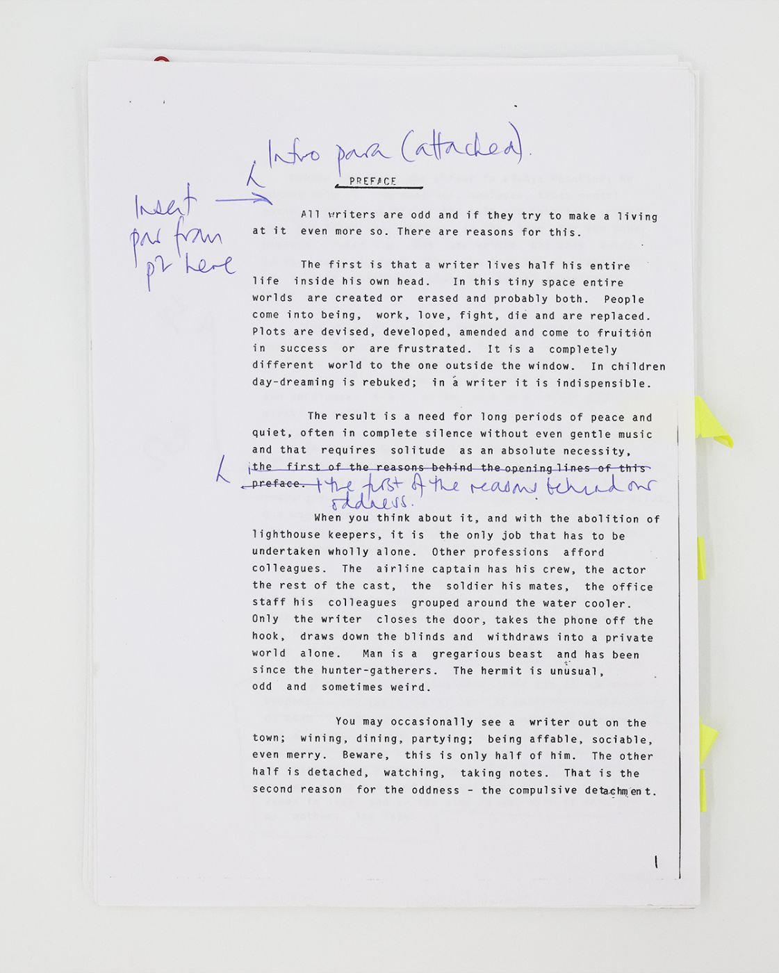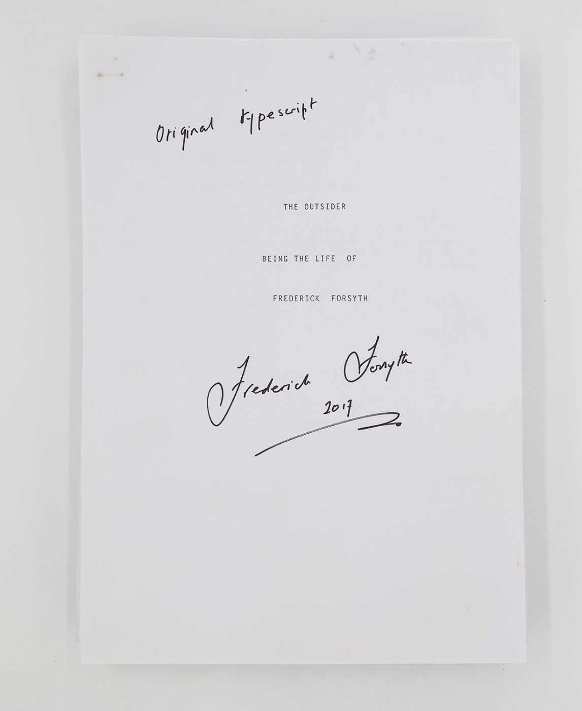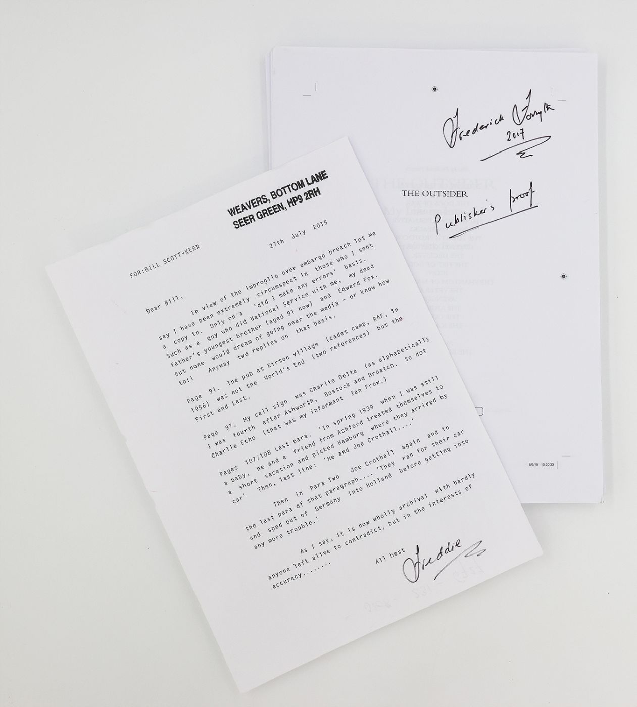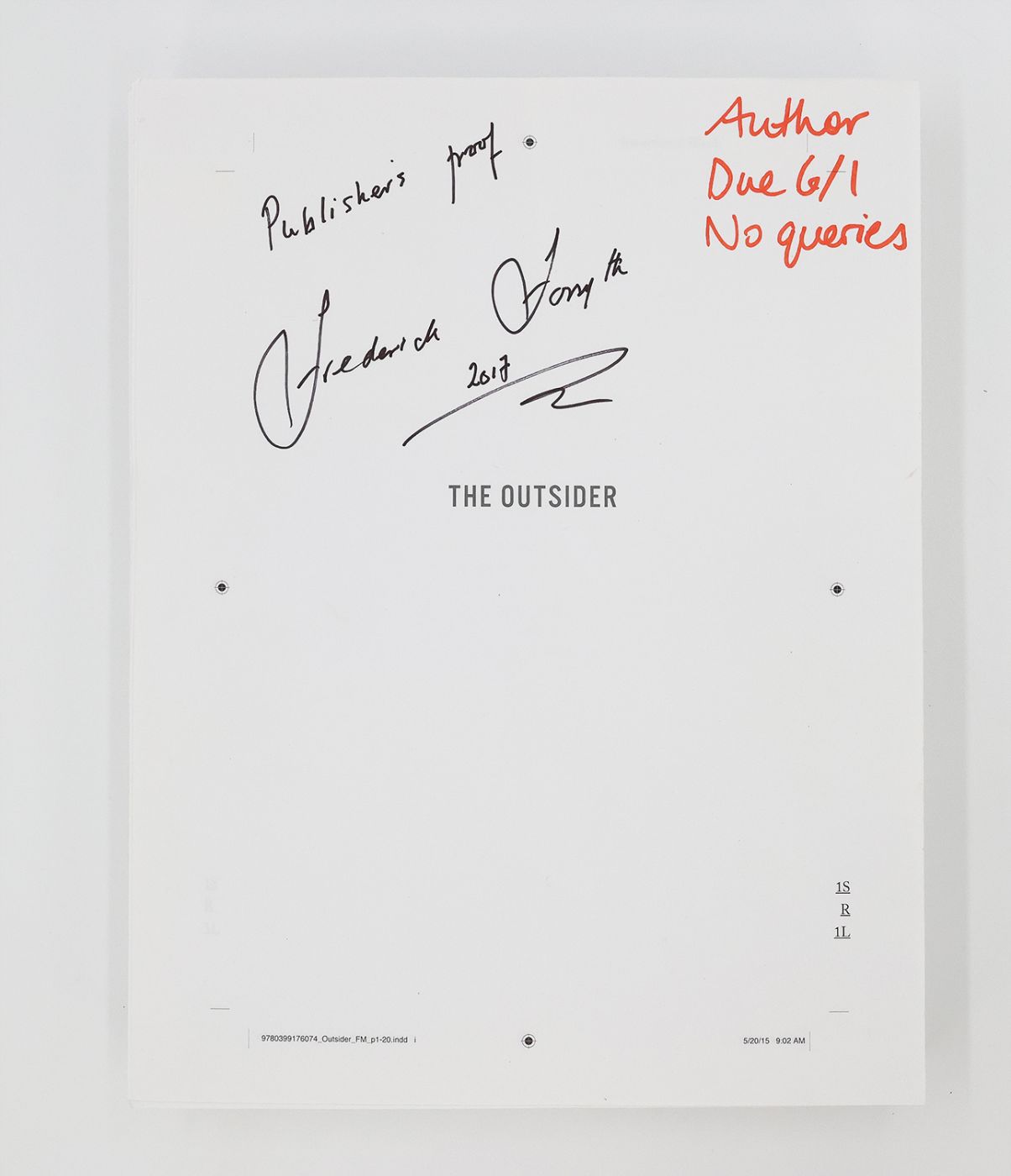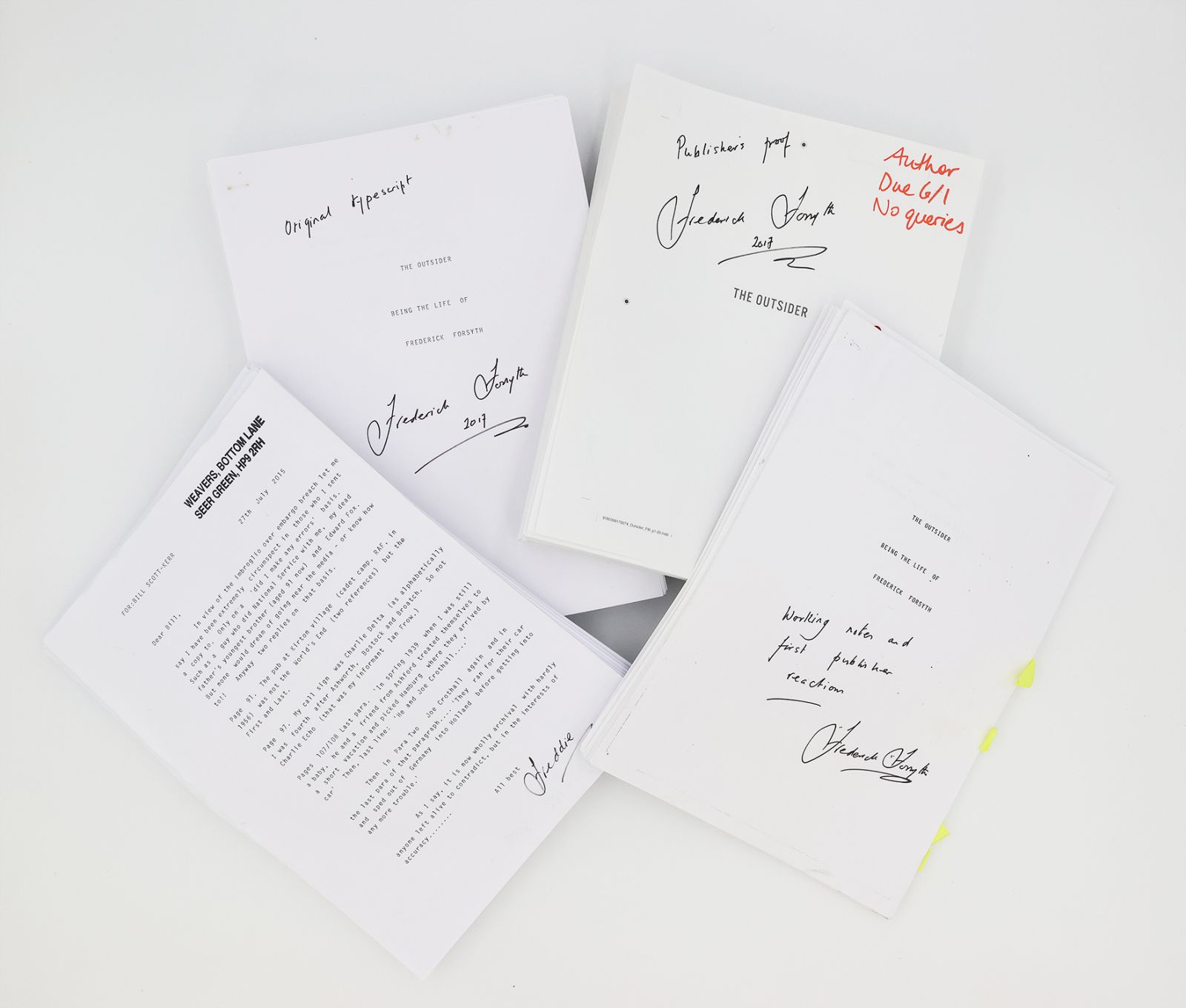Signed by the author. The typescript is staple bound in chapter gatherings for the first 14 chapters, loose sheets thereafter. Unpaginated, printed recto only. Inscribed by the author on the cover sheet "Original typescript / Frederick Forsyth 2017", with a loose sheet inscribed "original copy" laid in; The earliest state publisher's proof is 352 loose pages, printed recto only, inscribed in red ink to the upper right of the cover sheet "Author / Due 6.1 / No queries", further inscribed by the author in black ink "Publisher's proof / Frederick Forsyth / 2017"; Manuscript notes, typescript reworkings with holograph emendations, printed email correspondence and a letter dated 16th February 2015 from the author's publisher Bill Scott-Kerr concerning edit ideas to the preface and enclosing a revised copy of the master document; Later state publisher's proof, 367 loose pages, printed recto and verso,cover sheet inscribed by the author "Frederick Forsyth / 2017 / Publisher's proof", together with a letter dated 27th July 2015 from Forsyth to his publisher at Bantam Bill Scott-Kerr with some corrections and a possible embargo breach.
