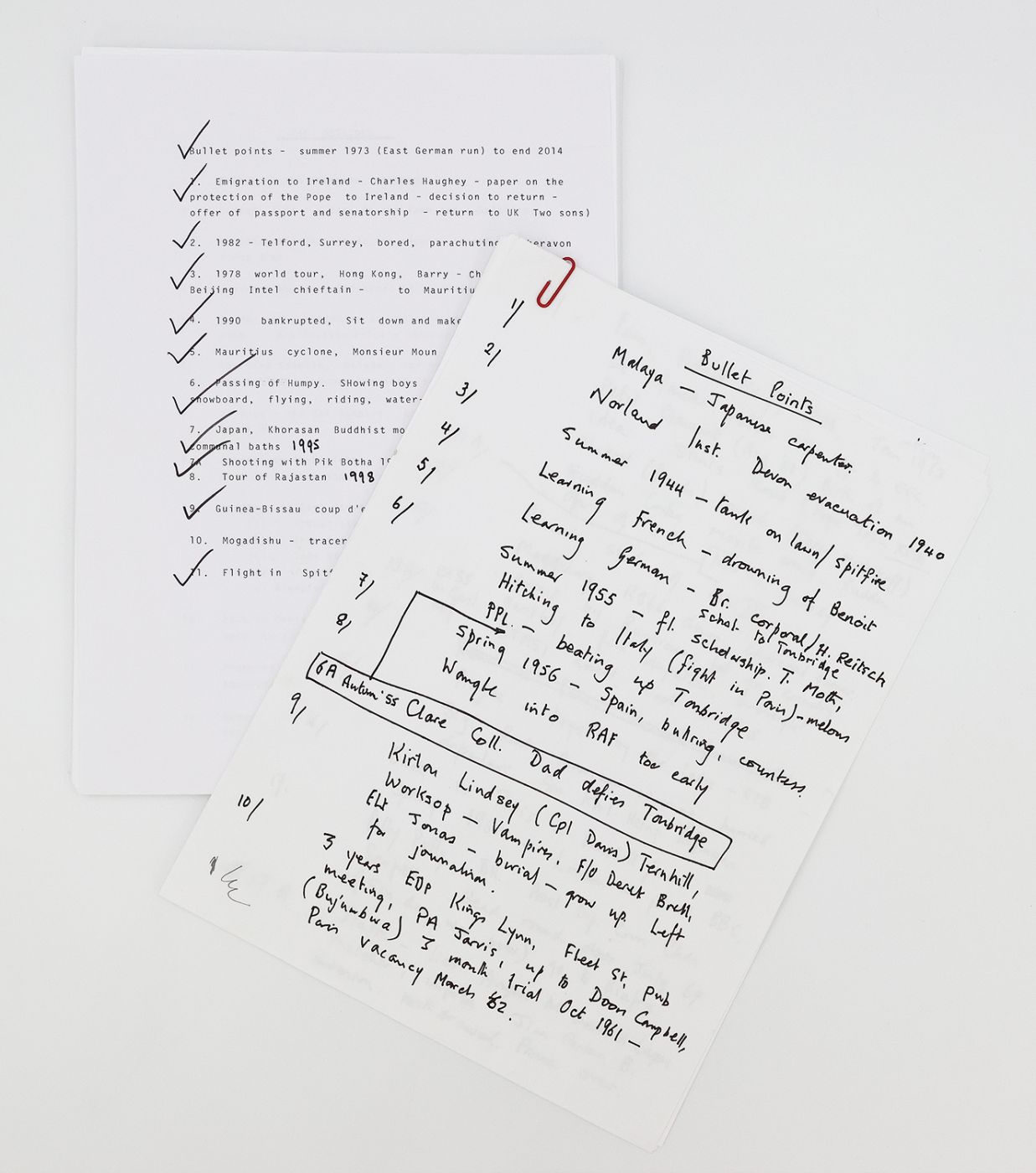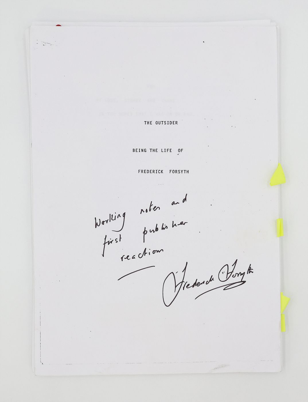 A series of vignettes, anecdotes and tall tales, in vaguely chronological order, that together form an autobiography of the bestselling novelist, journalist, fighter pilot and spy. These working papers formed part of a collection of the author's own proofs, manuscripts and film scripts, gifted to and inscribed for a close friend in 2017. The first edition was released for sale in September 2015. Provenance: Frederick Forsyth; gifted to Sally Harrison.