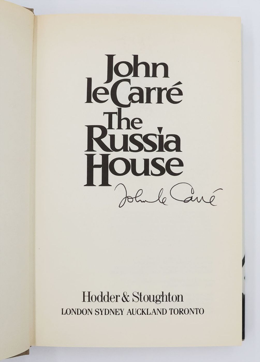 Signed by the author John Le Carré in black ink on the title page. The author's twelfth novel, 'The Russia House' was the basis of the Fred Schepisi film released in 1990, starring Sean Connery and Michelle Pfeiffer. It is notable for being one of the first western films and the first US film to be shot on location in the Soviet Union, with principal photography taking place in and around Moscow and St. Petersburg.